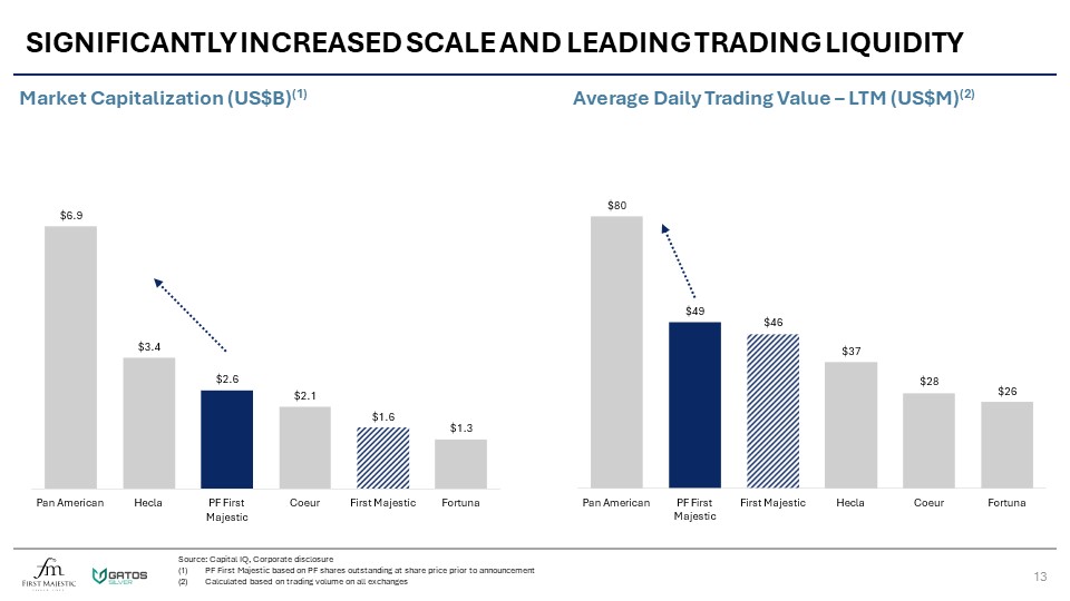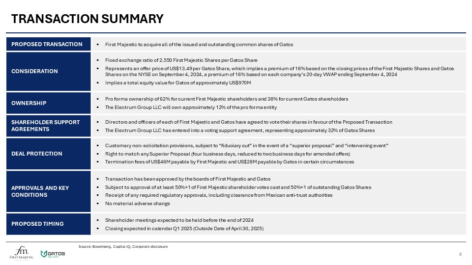 consideration implies a total offer value of US$13.49 per common share of Gatos based on the closing price of First Majestic’s common shares on the New York Stock Exchange (the “NYSE”) on September 4, 2024, and represents a 16% premium based on