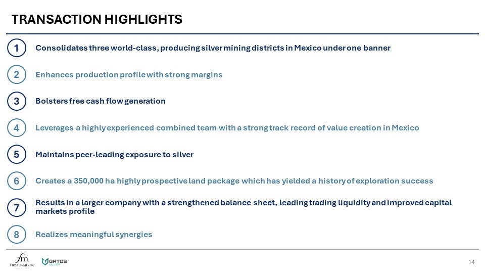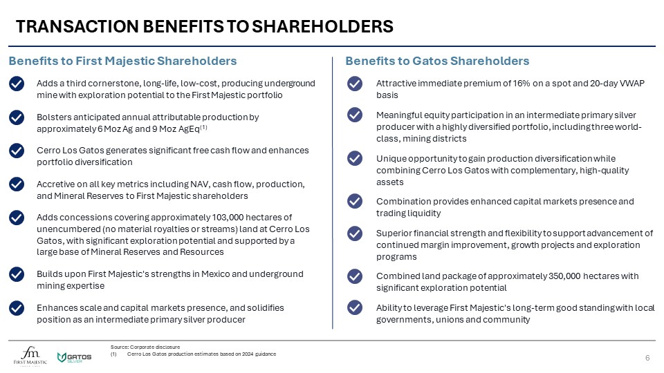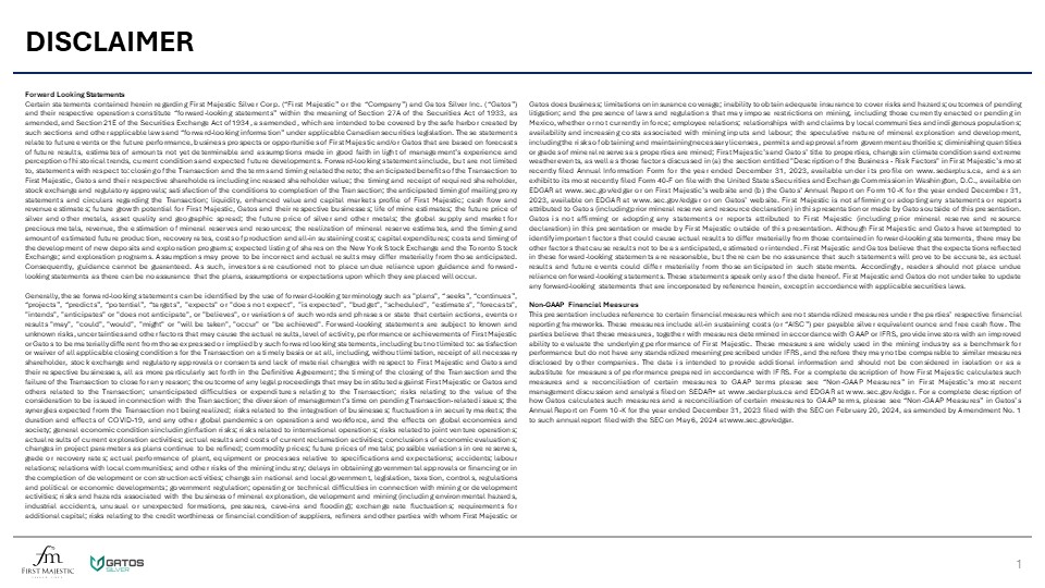compelling and transformative transaction that meaningfully enhances First Majestic’s operating platform through the addition of 70% of Cerro Los Gatos - a high quality, long-life, unencumbered, free cash flow generating asset in the