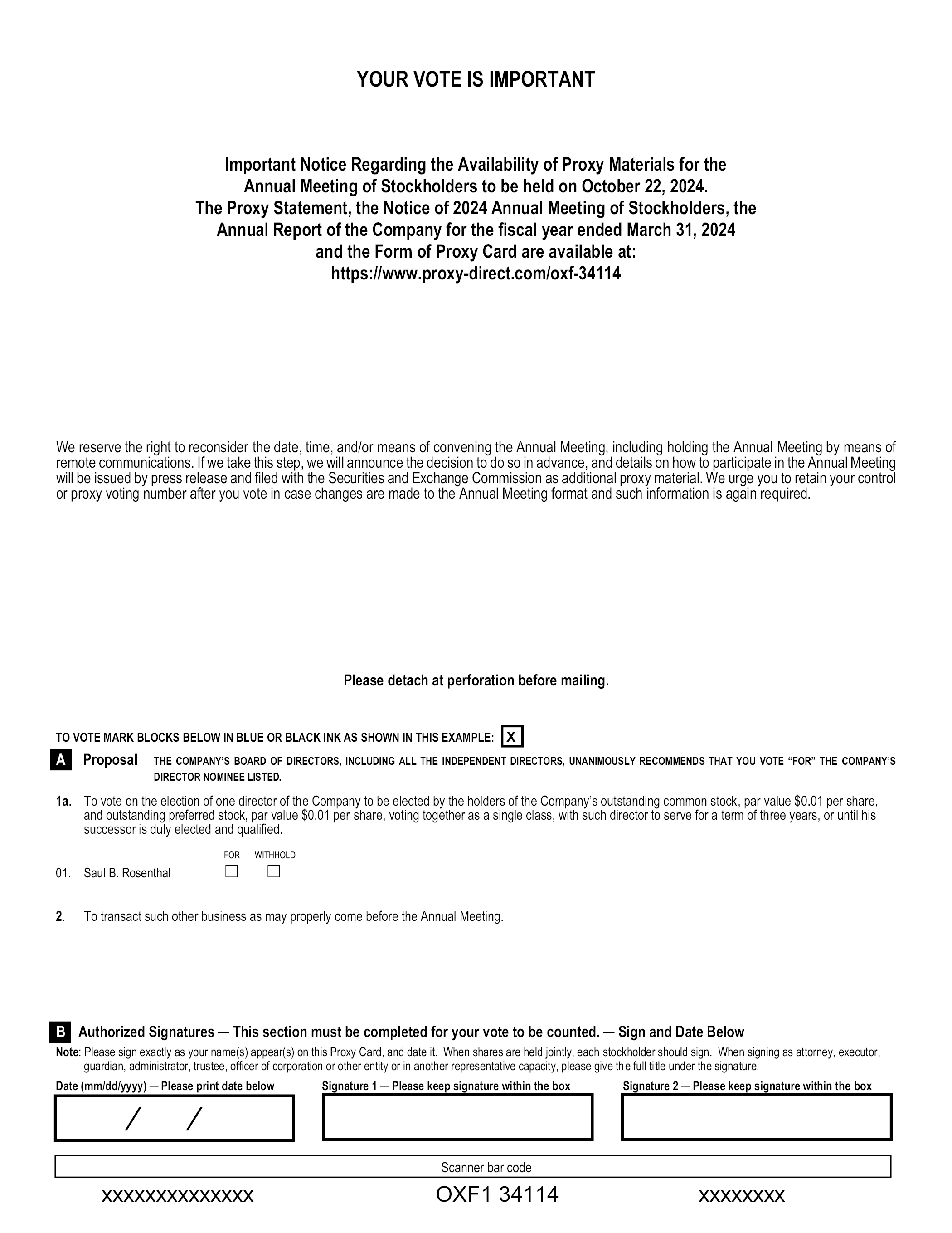 YOUR VOTE IS IMPORTANT Important Notice Regarding the Availability of Proxy Materials for the Annual Meeting of Stockholders to be held on October 22, 2024. The Proxy Statement, the Notice of 2024 Annual Meeting of Stockholders, the Annual Report of the Company for the fiscal year ended March 31, 2024 and the Form of Proxy Card are available at: https://www.proxy-direct.com/oxf-34114 We reserve the right to reconsider the date, time, and/or means of convening the Annual Meeting, including holding the Annual Meeting by means of remote communications. If we take this step, we will announce the decision to do so in advance, and details on how to participate in the Annual Meeting will be issued by press release and filed with the Securities and Exchange Commission as additional proxy material. We urge you to retain your control or proxy voting number after you vote in case changes are made to the Annual Meeting format and such information is again required. Please detach at perforation before mailing. TO VOTE MARK BLOCKS BELOW IN BLUE OR BLACK INK AS SHOWN IN THIS EXAMPLE: X A Proposal THE COMPANY’S BOARD OF DIRECTORS, INCLUDING ALL THE INDEPENDENT DIRECTORS, UNANIMOUSLY RECOMMENDS THAT YOU VOTE “FOR” THE COMPANY’S DIRECTOR NOMINEE LISTED. 1a. To vote on the election of one director of the Company to be elected by the holders of the Company’s outstanding common stock, par value $0.01 per share, and outstanding preferred stock, par value $0.01 per share, voting together as a single class, with such director to serve for a term of three years, or until his successor is duly elected and qualified. FOR WITHHOLD 01. Saul B. Rosenthal 2. To transact such other business as may properly come before the Annual Meeting. Authorized Signatures This section must be completed for your vote to be counted. Sign and Date Below Note: Please sign exactly as your name(s) appear(s) on this Proxy Card, and date it. When shares are held jointly, each stockholder should sign. When signing as attorney, executor, guardian, administrator, trustee, officer of corporation or other entity or in another representative capacity, please give the full title under the signature. Date (mm/dd/yyyy) Please print date below Signature 1 Please keep signature within the box Signature 2 Please keep signature within the box Scanner bar code xxxxxxxxxxxxxx OXF1 34114 xxxxxxxx
