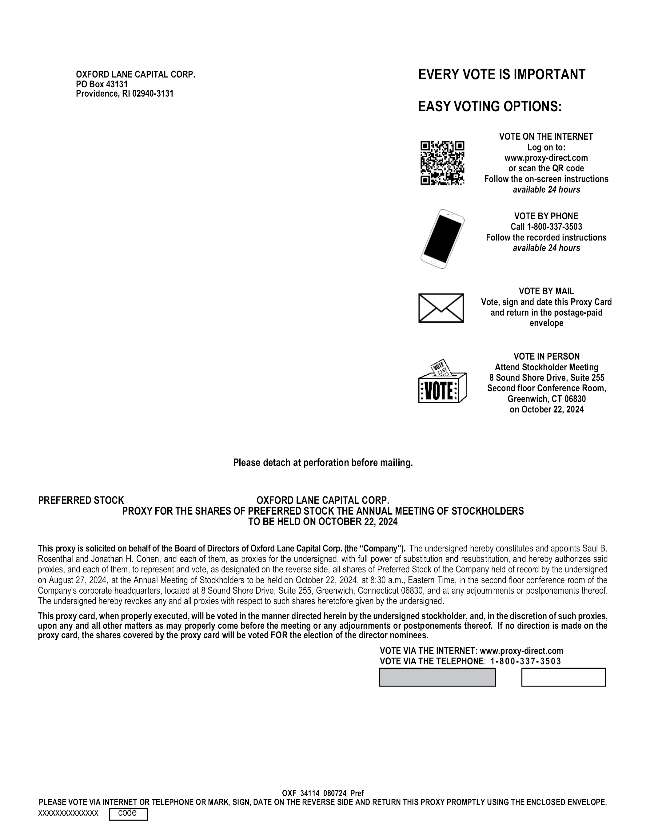 OXFORD LANE CAPITAL CORP. PO Box 43131 Providence, RI 02940-3131 EVERY VOTE IS IMPORTANT EASY VOTING OPTIONS: VOTE BY PHONE Call 1-800-337-3503 Follow the recorded instructions available 24 hours VOTE BY MAIL Vote, sign and date this Proxy Card and return in the postage-paid envelope VOTE IN PERSON Attend Stockholder Meeting 8 Sound Shore Drive, Suite 255 Second floor Conference Room, Greenwich, CT 06830 on October 22, 2024 VOTE ON THE INTERNET Log on to: www.proxy-direct.com or scan the QR code Follow the on-screen instructions available 24 hours Please detach at perforation before mailing. PREFERRED STOCK OXFORD LANE CAPITAL CORP. PROXY FOR THE SHARES OF PREFERRED STOCK THE ANNUAL MEETING OF STOCKHOLDERS TO BE HELD ON OCTOBER 22, 2024 This proxy is solicited on behalf of the Board of Directors of Oxford Lane Capital Corp. (the “Company”). The undersigned hereby constitutes and appoints Saul B. Rosenthal and Jonathan H. Cohen, and each of them, as proxies for the undersigned, with full power of substitution and resubstitution, and hereby authorizes said proxies, and each of them, to represent and vote, as designated on the reverse side, all shares of Preferred Stock of the Company held of record by the undersigned on August 27, 2024, at the Annual Meeting of Stockholders to be held on October 22, 2024, at 8:30 a.m., Eastern Time, in the second floor conference room of the Company’s corporate headquarters, located at 8 Sound Shore Drive, Suite 255, Greenwich, Connecticut 06830, and at any adjournments or postponements thereof. The undersigned hereby revokes any and all proxies with respect to such shares heretofore given by the undersigned. This proxy card, when properly executed, will be voted in the manner directed herein by the undersigned stockholder, and, in the discretion of such proxies, upon any and all other matters as may properly come before the meeting or any adjournments or postponements thereof. If no direction is made on the proxy card, the shares covered by the proxy card will be voted FOR the election of the director nominees. VOTE VIA THE INTERNET: www.proxy-direct.com VOTE VIA THE TELEPHONE: 1-800-337-3503 OXF_34114_080724_Pref PLEASE VOTE VIA INTERNET OR TELEPHONE OR MARK, SIGN, DATE ON THE REVERSE SIDE AND RETURN THIS PROXY PROMPTLY USING THE ENCLOSED ENVELOPE. xxxxxxxxxxxxxx code
