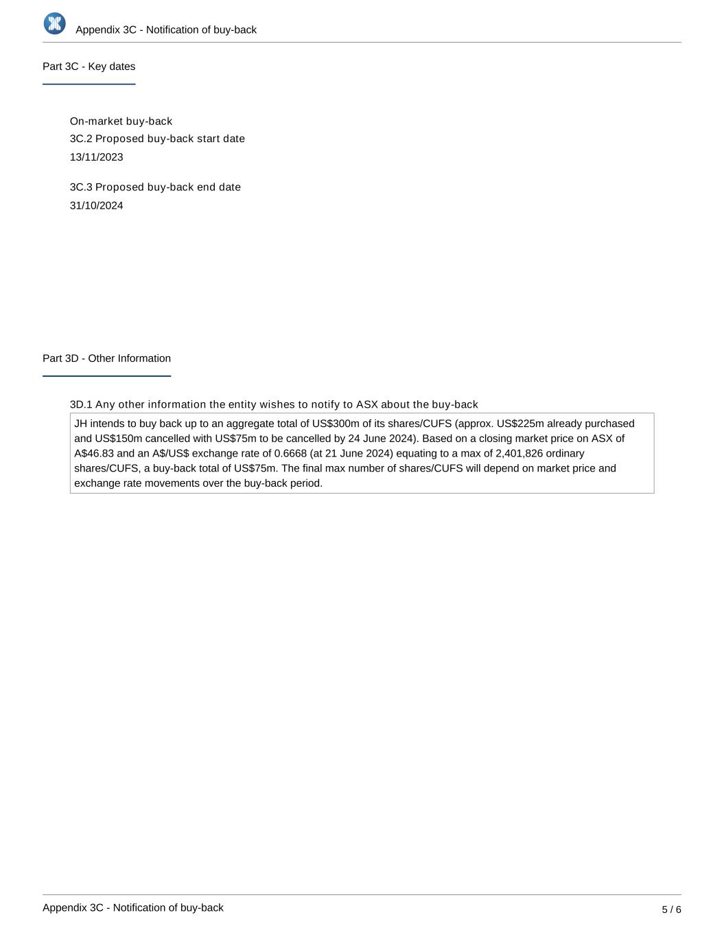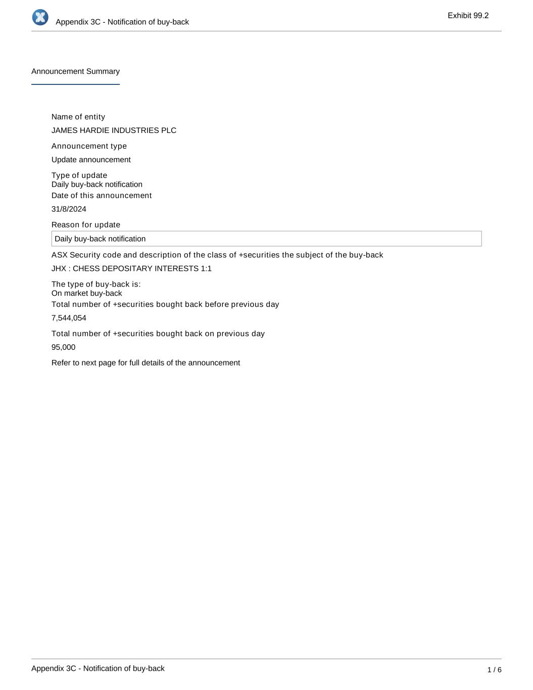 Forward-looking statements are based on the Company’s current expectations, estimates and assumptions and because forward-looking statements address future results, events and conditions, they, by their very nature, involve inherent risks and uncertainties, many of which are unforeseeable and beyond the Company’s control. Such known and unknown risks, uncertainties and other factors may cause actual results, performance or other achievements to differ materially from the anticipated results, performance or achievements expressed, projected or implied by these forward-looking statements. These factors, some of which are discussed under “Risk Factors” in Section 3 of the Form 20-F filed with the Securities and Exchange Commission on 20 May 2024, include, but are not limited to: all matters relating to or arising out of the prior manufacture of products that contained asbestos by current and former Company subsidiaries; required contributions to AICF, any shortfall in AICF funding and the effect of currency exchange rate movements on the amount recorded in the Company’s financial statements as an asbestos liability; compliance with and changes in tax laws and treatments; competition and product pricing in the markets in which the Company operates; the consequences of product failures or defects; exposure to environmental, asbestos, putative consumer class action or other legal proceedings; general economic and market conditions; the supply and cost of raw materials; possible increases in competition and the potential that competitors could copy the Company’s products; compliance with and changes in environmental and health and safety laws; risks of conducting business internationally; compliance with and changes in laws and regulations; currency exchange risks; dependence on customer preference and the concentration of the Company’s customer base; dependence on residential and commercial construction markets; the effect of adverse changes in climate or weather patterns; use of accounting estimates; and all other risks identified in the Company’s reports filed with Australian, Irish and US securities regulatory agencies and exchanges (as appropriate). The Company cautions you that the foregoing list of factors is not exhaustive and that other risks and uncertainties may cause actual results to differ materially from those referenced in the Company’s forward-looking statements. Forward-looking statements speak only as of the date they are made and are statements of the Company’s current expectations concerning future results, events and conditions. The Company assumes no obligation to update any forward-looking statements or information except as required by law.