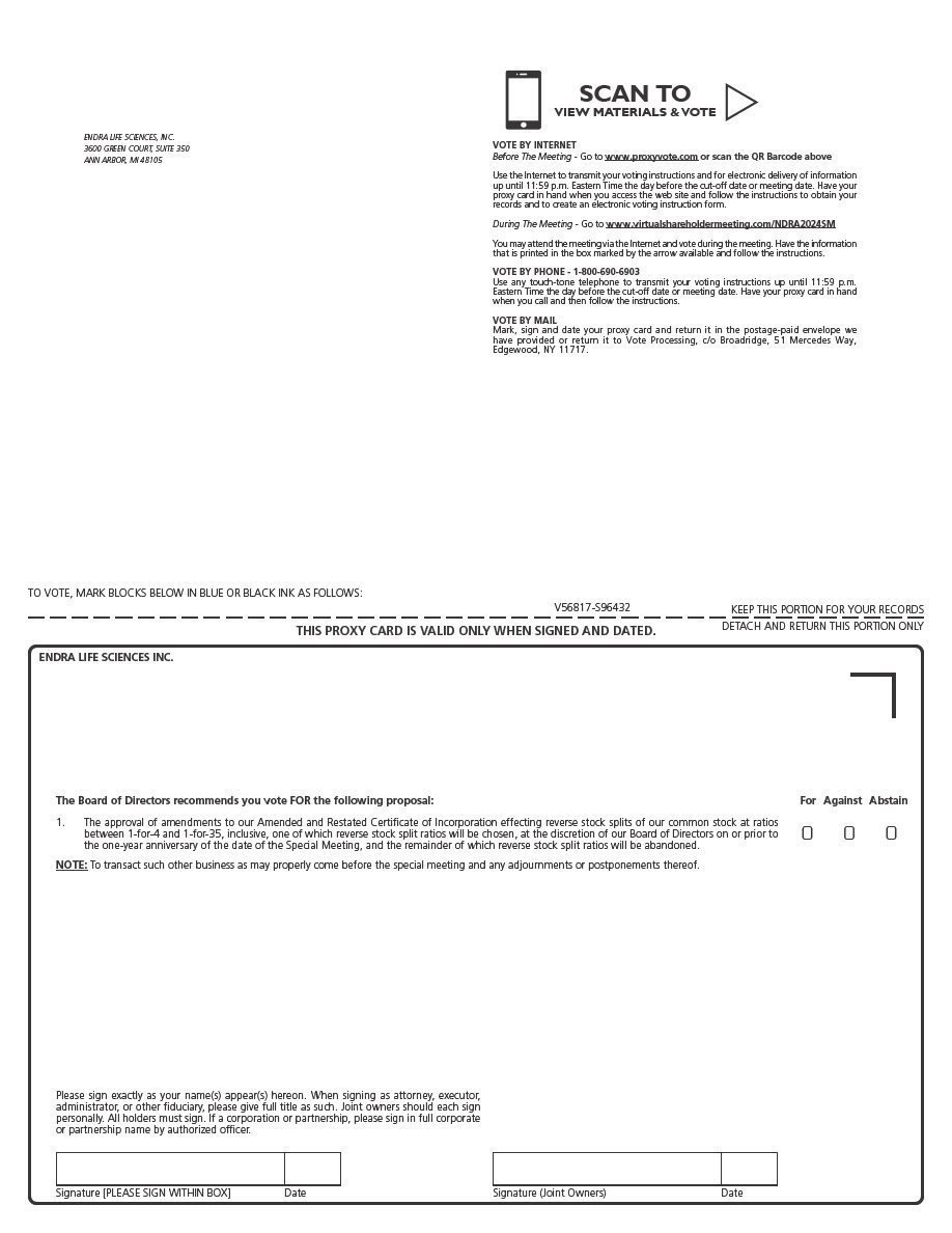 You are cordially invited to attend the special meeting of stockholders of ENDRA Life Sciences Inc. to be held at 9:00 a.m., Eastern Time, on October 28, 2024 and any adjournments or postponements thereof (the “Special Meeting”). The Special Meeting will be completely virtual and conducted via live webcast. You may attend the Special Meeting on the internet at www.virtualshareholdermeeting.com/NDRA2024SM. Prior to the Special Meeting you may submit questions by logging into proxyvote.com and, during the Special Meeting until polls are closed, you may vote by logging into www.virtualshareholdermeeting.com/NDRA2024SM using your stockholder information provided on the Notice of Internet Availability of Proxy Materials described below.