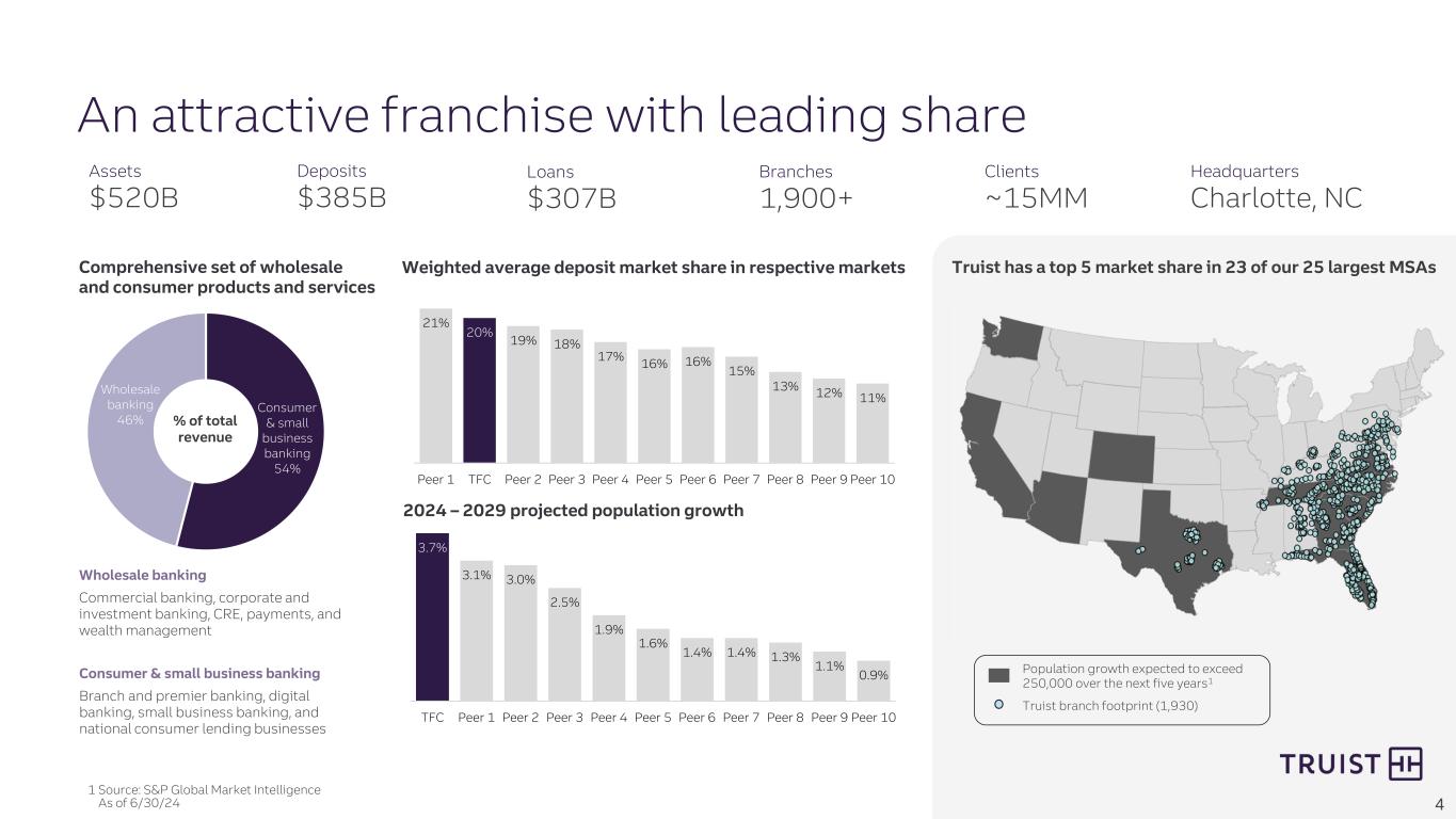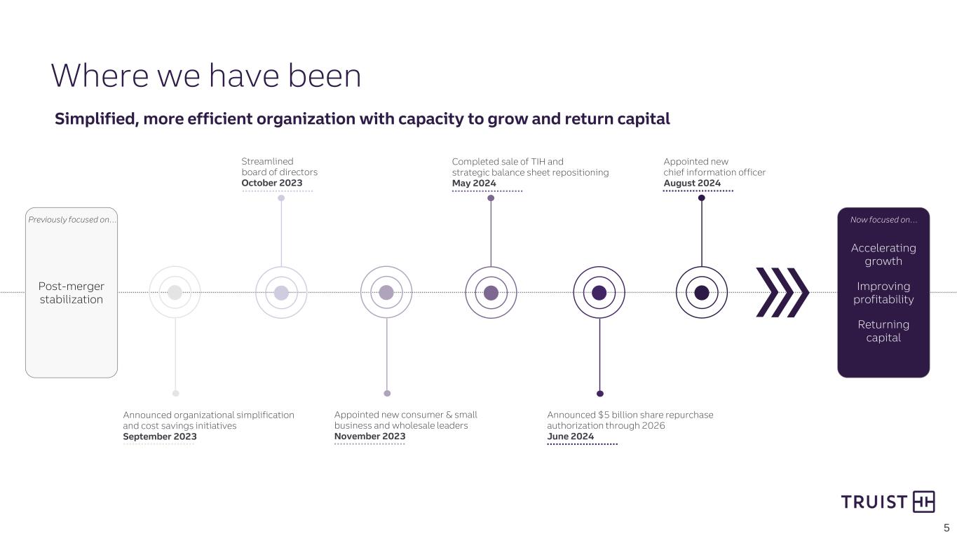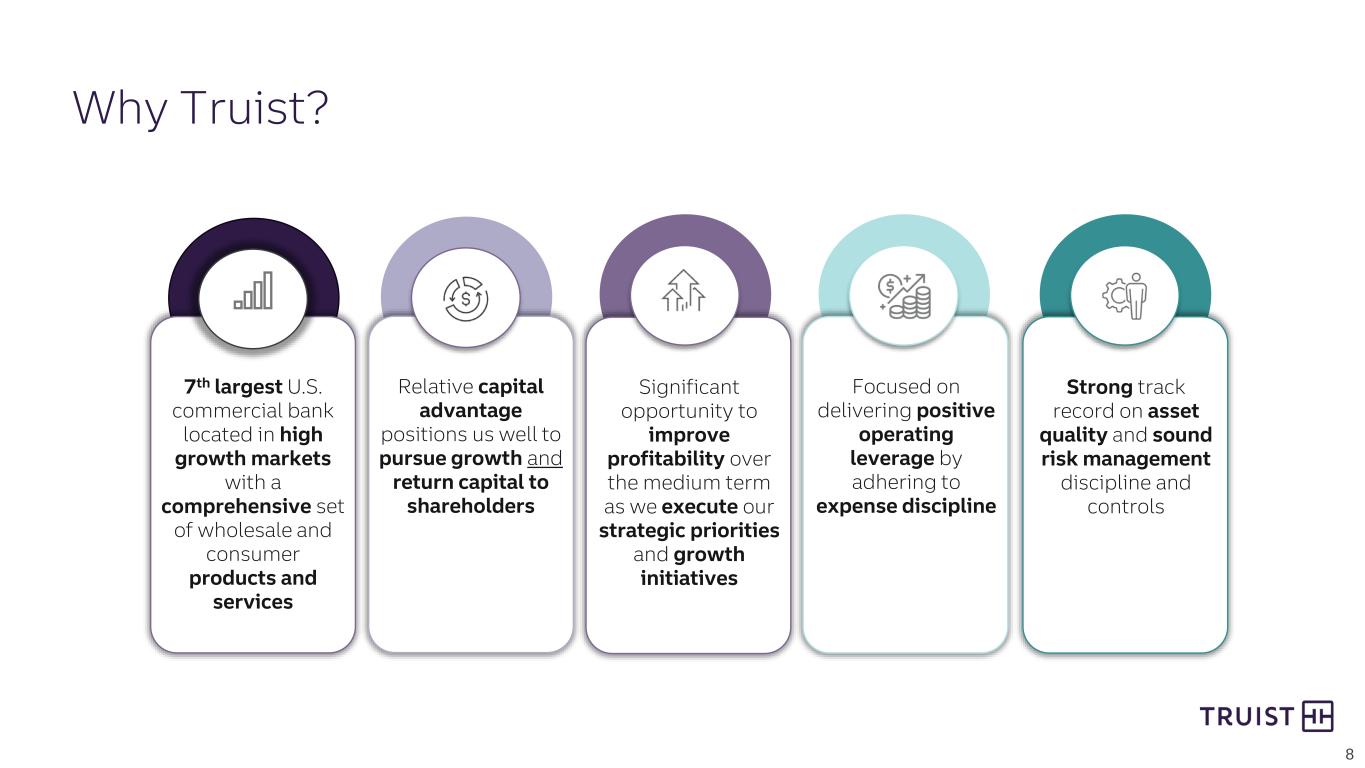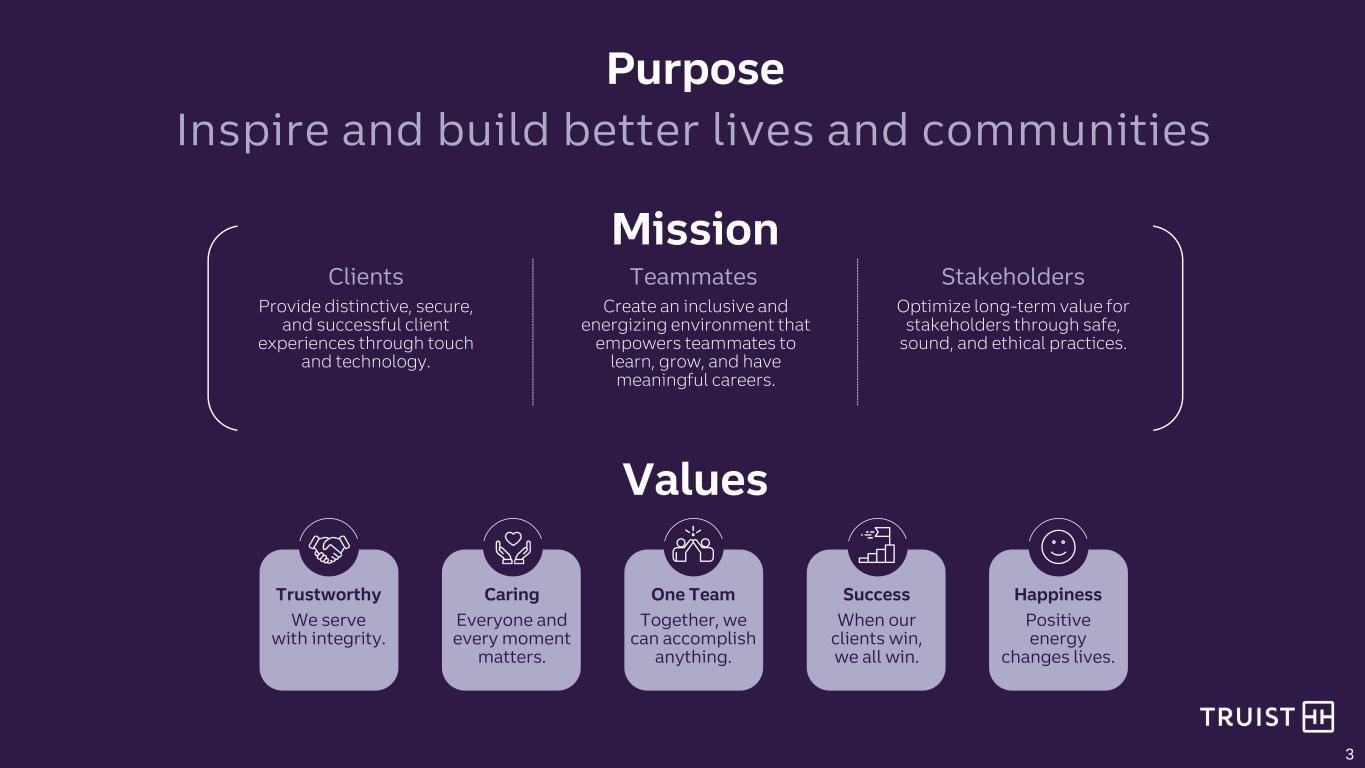 2 From time to time we have made, and in the future will make, forward-looking statements within the meaning of the Private Securities Litigation Reform Act of 1995. These statements can be identified by the fact that they do not relate strictly to historical or current facts. Forward-looking statements often use words such as “believe,” “expect,” “anticipate,” “intend,” “pursue,” “seek,” “continue,” “estimate,” “project,” “outlook,” “forecast,” “potential,” “target,” “objective,” “trend,” “plan,” “goal,” “initiative,” “priorities,” or other words of comparable meaning or future-tense or conditional verbs such as “may,” “will,” “should,” “would,” or “could.” Forward-looking statements convey our expectations, intentions, or forecasts about future events, circumstances, or results. This presentation, including any information incorporated by reference in this presentation, contains forward-looking statements. We also may make forward-looking statements in other documents that are filed or furnished with the SEC. In addition, we may make forward-looking statements orally or in writing to investors, analysts, members of the media, and others. All forward- looking statements, by their nature, are subject to assumptions, risks, and uncertainties, which may change over time and many of which are beyond our control. You should not rely on any forward-looking statement as a prediction or guarantee about the future. Actual future objectives, strategies, plans, prospects, performance, conditions, and results may differ materially from those set forth in any forward-looking statement. While no list of assumptions, risks, and uncertainties could be complete, some of the factors that may cause actual results or other future events or circumstances to differ from those in forward-looking statements include: • evolving political, business, economic, and market conditions at local, regional, national, and international levels; • monetary, fiscal, and trade laws or policies, including as a result of actions by governmental agencies, central banks, or supranational authorities; • the legal, regulatory, and supervisory environment, including changes in financial-services legislation, regulation, policies, or government officials or other personnel; • our ability to address heightened scrutiny and expectations from supervisory or other governmental authorities and to timely and credibly remediate related concerns or deficiencies; • judicial, regulatory, and administrative inquiries, examinations, investigations, proceedings, disputes, or rulings that create uncertainty for or are adverse to us or the financial-services industry; • the outcomes of judicial, regulatory, and administrative inquiries, examinations, investigations, proceedings, or disputes to which we are or may be subject and our ability to absorb and address any damages or other remedies that are sought or awarded and any collateral consequences; • evolving accounting standards and policies; • the adequacy of our corporate governance, risk-management framework, compliance programs, and internal controls over financial reporting, including our ability to control lapses or deficiencies in financial reporting, to make appropriate estimates, or to effectively mitigate or manage operational risk; • any instability or breakdown in the financial system, including as a result of the actual or perceived soundness of another financial institution or another participant in the financial system; • disruptions and shifts in investor sentiment or behavior in the securities, capital, or other financial markets, including financial or systemic shocks and volatility or changes in market liquidity, interest or currency rates, or valuations; • our ability to cost-effectively fund our businesses and operations, including by accessing long- and short-term funding and liquidity and by retaining and growing client deposits; • changes in any of our credit ratings; • our ability to manage any unexpected outflows of uninsured deposits and avoid selling investment securities or other assets at an unfavorable time or at a loss; • negative market perceptions of our investment portfolio or its value; • adverse publicity or other reputational harm to us, our service providers, or our senior officers; • business and consumer sentiment, preferences, or behavior, including spending, borrowing, or saving by businesses or households; • our ability to execute on strategic and operational plans, including simplifying our businesses, achieving cost-savings targets and lowering expense growth, accelerating franchise momentum, and improving our capital position; • changes in our corporate and business strategies, the composition of our assets, or the way in which we fund those assets; • our ability to successfully make and integrate acquisitions and to effect divestitures, including the ability to successfully deploy the proceeds from the sale of TIH and perform our obligations under the transition services arrangements supporting TIH in a cost-effective and efficient manner; • our ability to develop, maintain, and market our products or services or to absorb unanticipated costs or liabilities associated with those products or services; • our ability to innovate, to anticipate the needs of current or future clients, to successfully compete, to increase or hold market share in changing competitive environments, or to deal with pricing or other competitive pressures; • our ability to maintain secure and functional financial, accounting, technology, data processing, or other operating systems or infrastructure, including those that safeguard personal and other sensitive information; • our ability to appropriately underwrite loans that we originate or purchase and to otherwise manage credit risk; • our ability to satisfactorily and profitably per