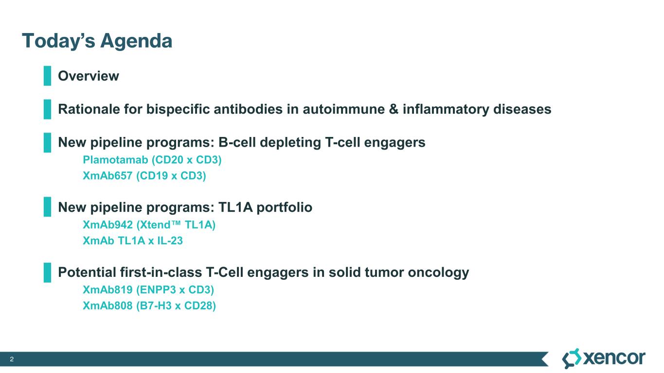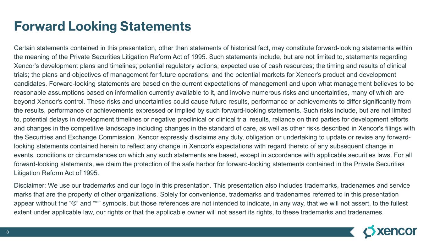 2 Today’s Agenda Overview Rationale for bispecific antibodies in autoimmune & inflammatory diseases New pipeline programs: B-cell depleting T-cell engagers Plamotamab (CD20 x CD3) XmAb657 (CD19 x CD3) New pipeline programs: TL1A portfolio XmAb942 (Xtend TL1A) XmAb TL1A x IL-23 Potential first-in-class T-Cell engagers in solid tumor oncology XmAb819 (ENPP3 x CD3) XmAb808 (B7-H3 x CD28)