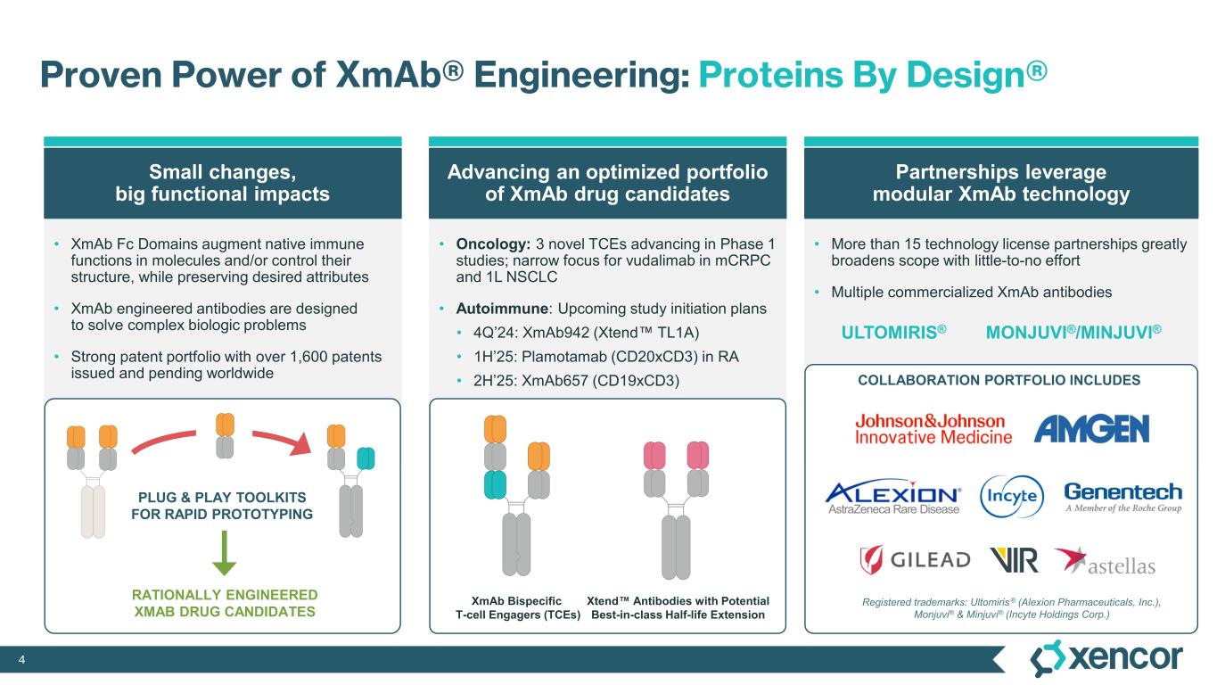 3 Forward Looking Statements Certain statements contained in this presentation, other than statements of historical fact, may constitute forward-looking statements within the meaning of the Private Securities Litigation Reform Act of 1995. Such statements include, but are not limited to, statements regarding Xencor's development plans and timelines; potential regulatory actions; expected use of cash resources; the timing and results of clinical trials; the plans and objectives of management for future operations; and the potential markets for Xencor's product and development candidates. Forward-looking statements are based on the current expectations of management and upon what management believes to be reasonable assumptions based on information currently available to it, and involve numerous risks and uncertainties, many of which are beyond Xencor's control. These risks and uncertainties could cause future results, performance or achievements to differ significantly from the results, performance or achievements expressed or implied by such forward-looking statements. Such risks include, but are not limited to, potential delays in development timelines or negative preclinical or clinical trial results, reliance on third parties for development efforts and changes in the competitive landscape including changes in the standard of care, as well as other risks described in Xencor's filings with the Securities and Exchange Commission. Xencor expressly disclaims any duty, obligation or undertaking to update or revise any forward- looking statements contained herein to reflect any change in Xencor's expectations with regard thereto of any subsequent change in events, conditions or circumstances on which any such statements are based, except in accordance with applicable securities laws. For all forward-looking statements, we claim the protection of the safe harbor for forward-looking statements contained in the Private Securities Litigation Reform Act of 1995. Disclaimer: We use our trademarks and our logo in this presentation. This presentation also includes trademarks, tradenames and service marks that are the property of other organizations. Solely for convenience, trademarks and tradenames referred to in this presentation appear without the “®” and “ ” symbols, but those references are not intended to indicate, in any way, that we will not assert, to the fullest extent under applicable law, our rights or that the applicable owner will not assert its rights, to these trademarks and tradenames.