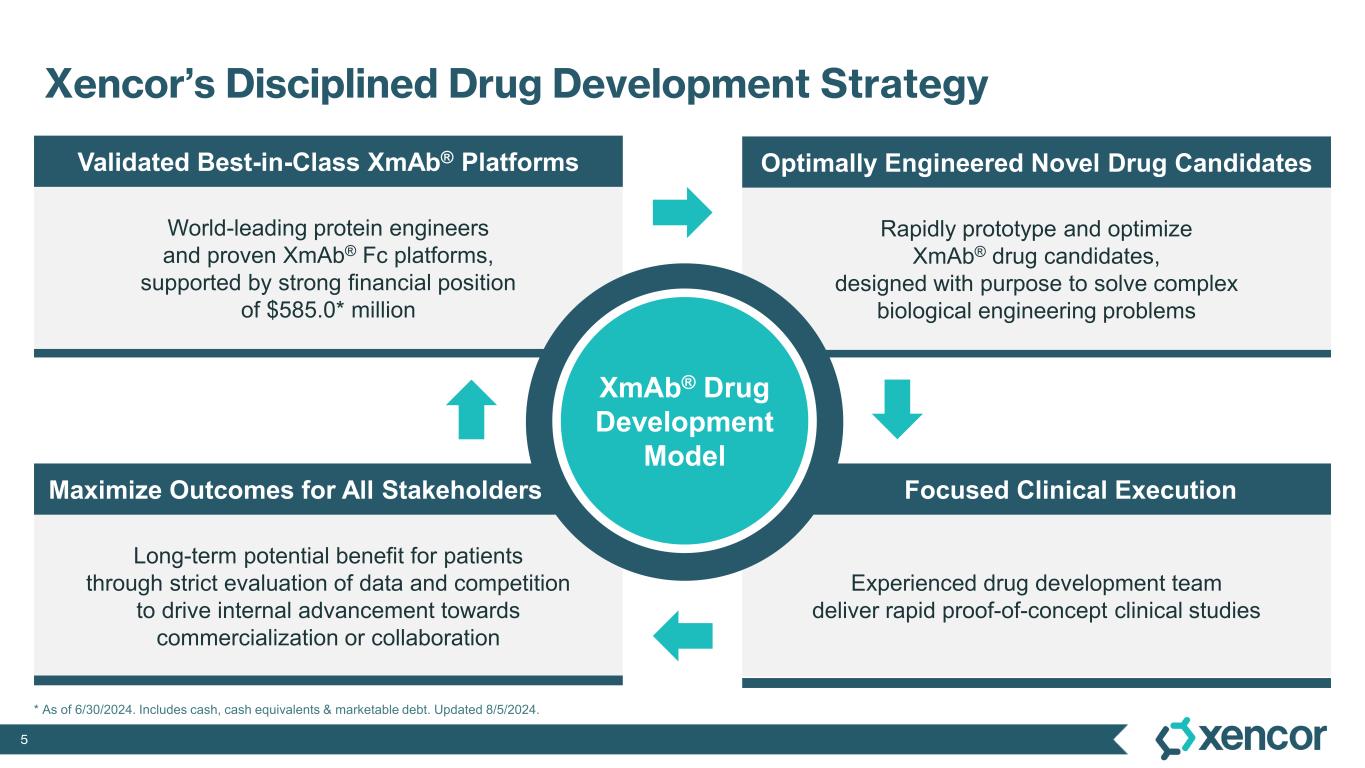 4 • XmAb Fc Domains augment native immune functions in molecules and/or control their structure, while preserving desired attributes • XmAb engineered antibodies are designed to solve complex biologic problems • Strong patent portfolio with over 1,600 patents issued and pending worldwide • Oncology: 3 novel TCEs advancing in Phase 1 studies; narrow focus for vudalimab in mCRPC and 1L NSCLC • Autoimmune: Upcoming study initiation plans • 4Q’24: XmAb942 (Xtend TL1A) • 1H’25: Plamotamab (CD20xCD3) in RA • 2H’25: XmAb657 (CD19xCD3) • More than 15 technology license partnerships greatly broadens scope with little-to-no effort • Multiple commercialized XmAb antibodies ULTOMIRIS® MONJUVI®/MINJUVI® Proven Power of XmAb® Engineering: Proteins By Design® AstraZeneca Rare Disease Small changes, big functional impacts Advancing an optimized portfolio of XmAb drug candidates Partnerships leverage modular XmAb technology Registered trademarks: Ultomiris® (Alexion Pharmaceuticals, Inc.), Monjuvi® & Minjuvi® (Incyte Holdings Corp.) COLLABORATION PORTFOLIO INCLUDES XmAb Bispecific T-cell Engagers (TCEs) Xtend Antibodies with Potential Best-in-class Half-life Extension PLUG & PLAY TOOLKITS FOR RAPID PROTOTYPING RATIONALLY ENGINEERED XMAB DRUG CANDIDATES