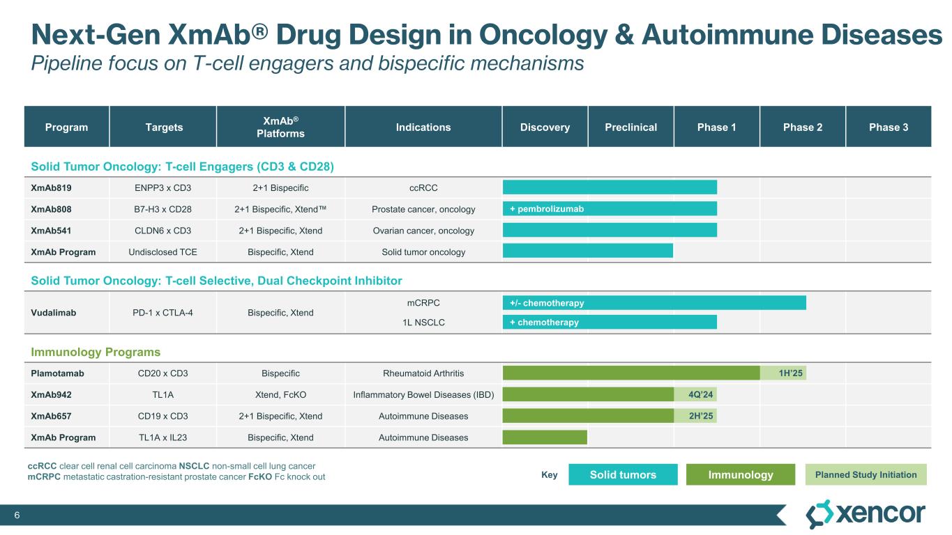 5 World-leading protein engineers and proven XmAb® Fc platforms, supported by strong financial position of $585.0* million Experienced drug development team deliver rapid proof-of-concept clinical studies Rapidly prototype and optimize XmAb® drug candidates, designed with purpose to solve complex biological engineering problems Long-term potential benefit for patients through strict evaluation of data and competition to drive internal advancement towards commercialization or collaboration Xencor’s Disciplined Drug Development Strategy Validated Best-in-Class XmAb® Platforms Optimally Engineered Novel Drug Candidates Maximize Outcomes for All Stakeholders Focused Clinical Execution XmAb® Drug Development Model * As of 6/30/2024. Includes cash, cash equivalents & marketable debt. Updated 8/5/2024.