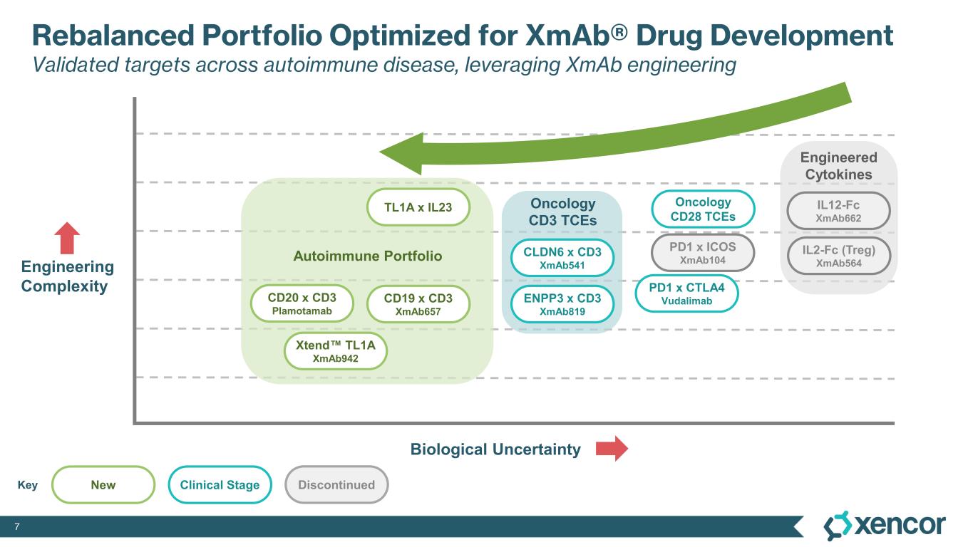 6 Program Targets XmAb® Platforms Indications Discovery Preclinical Phase 1 Phase 2 Phase 3 Solid Tumor Oncology: T-cell Engagers (CD3 & CD28) XmAb819 ENPP3 x CD3 2+1 Bispecific ccRCC XmAb808 B7-H3 x CD28 2+1 Bispecific, Xtend Prostate cancer, oncology XmAb541 CLDN6 x CD3 2+1 Bispecific, Xtend Ovarian cancer, oncology XmAb Program Undisclosed TCE Bispecific, Xtend Solid tumor oncology Solid Tumor Oncology: T-cell Selective, Dual Checkpoint Inhibitor Vudalimab PD-1 x CTLA-4 Bispecific, Xtend mCRPC 1L NSCLC Immunology Programs Plamotamab CD20 x CD3 Bispecific Rheumatoid Arthritis XmAb942 TL1A Xtend, FcKO Inflammatory Bowel Diseases (IBD) XmAb657 CD19 x CD3 2+1 Bispecific, Xtend Autoimmune Diseases XmAb Program TL1A x IL23 Bispecific, Xtend Autoimmune Diseases + chemotherapy Solid tumors Immunology + pembrolizumab +/- chemotherapy Key ccRCC clear cell renal cell carcinoma NSCLC non-small cell lung cancer mCRPC metastatic castration-resistant prostate cancer FcKO Fc knock out 1H’25 4Q’24 2H’25 Planned Study Initiation Next-Gen XmAb® Drug Design in Oncology & Autoimmune Diseases Pipeline focus on T-cell engagers and bispecific mechanisms