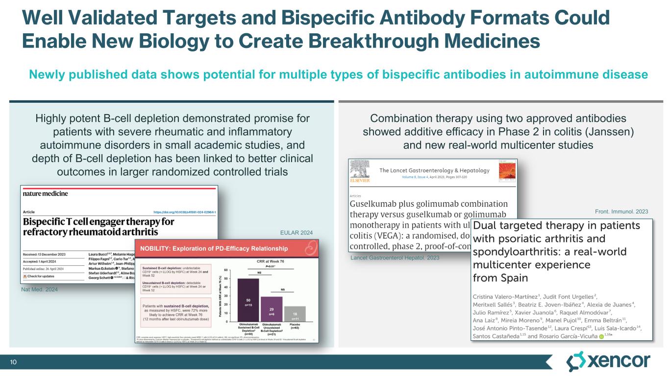 9 ACCESSDOSINGMANUFACTURING REGULATORYPROOF OF CONCEPTSCIENTIFIC RATIONALE New Era Emerging for Bispecific Antibody Drug Development in Autoimmune and Inflammatory Diseases Recent clinical and academic studies have highlighted exciting clinical potential of both mechanisms Multiple related signaling pathways involved in A&I support dual inhibition (BsAbs) and depth of inhibition (TCEs) Recent U.S. FDA insight encourages BsAb development1 beyond oncology Efficient manufacturing process to produce one drug molecule versus multiple drugs in combination or cellular therapies Avoids complicated clinical dosing algorithms, with dual therapy and/or problematic co-formulation More favorable formulary access for a single drug product versus multiple drugs used in combination BsAb bispecific antibody TCE T-cell engager 1 “The agency has been encouraging drug development in this area. In 2021, FDA finalized a guidance on BsAb development programs.” (U.S. FDA, 2024)