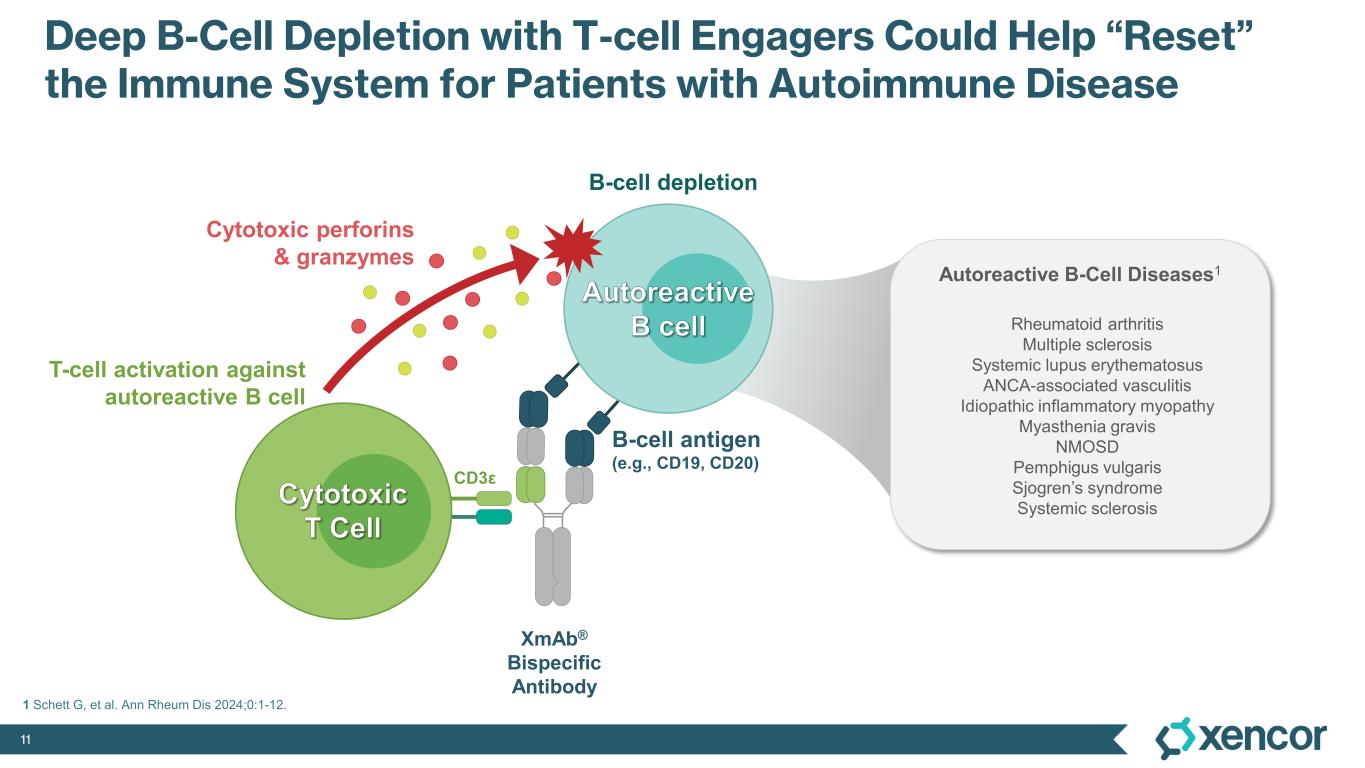 10 Well Validated Targets and Bispecific Antibody Formats Could Enable New Biology to Create Breakthrough Medicines Combination therapy using two approved antibodies showed additive efficacy in Phase 2 in colitis (Janssen) and new real-world multicenter studies Highly potent B-cell depletion demonstrated promise for patients with severe rheumatic and inflammatory autoimmune disorders in small academic studies, and depth of B-cell depletion has been linked to better clinical outcomes in larger randomized controlled trials Newly published data shows potential for multiple types of bispecific antibodies in autoimmune disease Nat Med. 2024 EULAR 2024 Front. Immunol. 2023 Lancet Gastroenterol Hepatol. 2023