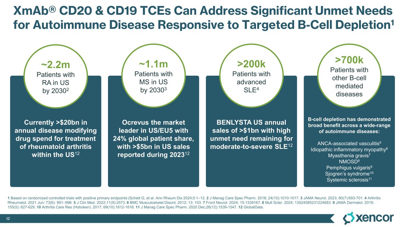 11 Deep B-Cell Depletion with T-cell Engagers Could Help “Reset” the Immune System for Patients with Autoimmune Disease B-cell antigen (e.g., CD19, CD20) B-cell depletion T-cell activation against autoreactive B cell XmAb® Bispecific Antibody Autoreactive B-Cell Diseases1 Cytotoxic perforins & granzymes CD3ε Rheumatoid arthritis Multiple sclerosis Systemic lupus erythematosus ANCA-associated vasculitis Idiopathic inflammatory myopathy Myasthenia gravis NMOSD Pemphigus vulgaris Sjogren’s syndrome Systemic sclerosis 1 Schett G, et al. Ann Rheum Dis 2024;0:1-12.