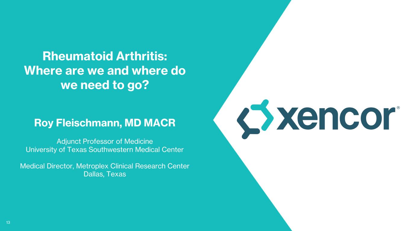 12 XmAb® CD20 & CD19 TCEs Can Address Significant Unmet Needs for Autoimmune Disease Responsive to Targeted B-Cell Depletion1 Currently >$20bn in annual disease modifying drug spend for treatment of rheumatoid arthritis within the US12 Ocrevus the market leader in US/EU5 with 24% global patient share, with >$5bn in US sales reported during 202312 BENLYSTA US annual sales of >$1bn with high unmet need remaining for moderate-to-severe SLE12 B-cell depletion has demonstrated broad benefit across a wide-range of autoimmune diseases: ANCA-associated vasculitis5 Idiopathic inflammatory myopathy6 Myasthenia gravis7 NMOSD8 Pemphigus vulgaris9 Sjogren’s syndrome10 Systemic sclerosis11 ~2.2m Patients with RA in US by 20302 ~1.1m Patients with MS in US by 20303 >200k Patients with advanced SLE4 >700k Patients with other B-cell mediated diseases 1 Based on randomized controlled trials with positive primary endpoints (Schett G, et al. Ann Rheum Dis 2024;0:1–12. 2 J Manag Care Spec Pharm. 2018; 24(10):1010-1017. 3 JAMA Neurol. 2023; 80(7):693-701. 4 Arthritis Rheumatol. 2021 Jun; 73(6): 991–996. 5 J Clin Med. 2022;11(9):2573. 6 BMC Musculoskelet Disord. 2012; 13: 103. 7 Front Neurol. 2024; 15:1339167. 8 Mult Scler. 2024; 13524585231224683. 9 JAMA Dermatol. 2019; 155(5): 627-629. 10 Arthritis Care Res (Hoboken). 2017; 69(10):1612-1616. 11 J Manag Care Spec Pharm. 2020 Dec;26(12):1539-1547. 12 GlobalData.
