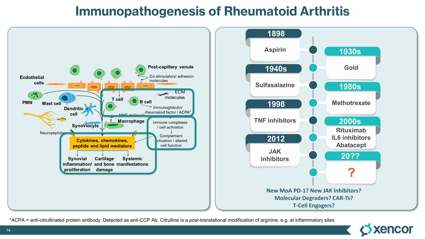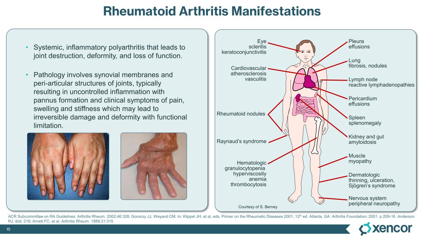 14 *ACPA = anti-citrullinated protein antibody. Detected as anti-CCP Ab. Citrulline is a post-translational modification of arginine, e.g. at inflammatory sites Rituximab IL6 inhibitors Abatacept 2000s Methotrexate 1980s Gold 1930sAspirin 1898 Sulfasalazine 1940s TNF inhibitors 1998 JAK inhibitors 2012 ? 20?? New MoA PD-1? New JAK inhibitors? Molecular Degraders? CAR-Ts? T-Cell Engagers? Immunopathogenesis of Rheumatoid Arthritis