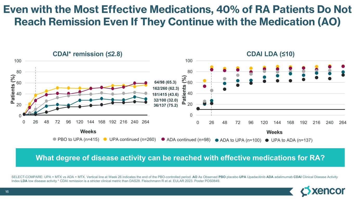 16 Even with the Most Effective Medications, 40% of RA Patients Do Not Reach Remission Even If They Continue with the Medication (AO) 0 20 40 60 80 100 SELECT-COMPARE: UPA + MTX vs ADA + MTX. Vertical line at Week 26 indicates the end of the PBO-controlled period. AO As Observed PBO placebo UPA Upadacitinib ADA adalimumab CDAI Clinical Disease Activity Index LDA low disease activity * CDAI remission is a stricter clinical metric than DAS28. Fleischmann R et al. EULAR 2023. Poster POS0849. 26 48 72 96 144 168 192120 216 240 264 Weeks CDAI* remission (≤2.8) CDAI LDA (≤10) 0 ADA continued (n=98)PBO to UPA (n=415) UPA continued (n=260) ADA to UPA (n=100) UPA to ADA (n=137) Pa tie nt s (% ) 0 20 40 60 80 100 26 48 72 96 144 168 1921200 216 240 264 Weeks Pa tie nt s (% ) 162/260 (62.3) 64/98 (65.3) 181/415 (43.6) 32/100 (32.0) 36/137 (75.2) What degree of disease activity can be reached with effective medications for RA?
