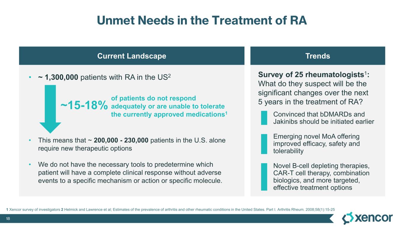 17 RA patients have an increased risk of CV events1,2. Risk of CVD death 50% higher vs. general population, which correlates with CV risk factors and inflammation3,4. DMARDs reduce CV event risk5,6 if disease activity reduced7. Severe disease activity in RA patients is correlated with a 70-fold increased risk of developing malignant lymphomas, particularly diffuse large B cell lymphoma10. RA is associated with a 2-fold increased risk of SIE, thought to be due to defective immune system and comorbidities such as diabetes, pulmonary or renal disease and functional disability8. TNFα inhibitors increase the risk 2-fold and glucocorticoids 4-fold. Active RA is associated with a > 2-fold increase in the development of deep venous thrombosis and pulmonary embolus compared to the general population9. Consequences of Inadequately Treated RA Cardiovascular Disease (CVD) Serious Infection (SIE) Venous and Pulmonary Thrombosis Lymphoma 1 Avina-Zubieta JA, et al. Risk of cardiovascular mortality in patients with rheumatoid arthritis: a meta-analysis of observational studies. Arthritis Rheum 2008;59:1690-7. 2 Solomon DH, et al. Cardiovascular morbidity and mortality in women diagnosed with rheumatoid arthritis. Circulation 2003; 107:1303-7. 3 Del Rincon I, et al. Escalante A. Association between carotid atherosclerosis and markers of inflammation in rheumatoid arthritis patients and healthy subjects. Arthritis Rheum 2002;48:1833-40. 4 Myasoedova E, et al. Lipid paradox in rheumatoid arthritis: the impact of serum lipid measures and systemic inflammation on the risk of cardiovascular disease. Ann Rheum Dis 2011;70:482-7. 5 Micha R, et al. Systematic review and metaanalysis of methotrexate use and risk of cardiovascular disease. Am J Cardiol 2011;108:1362-70. 6 Barnabe C, et al. Systematic review and metaanalysis: anti-tumor necrosis factor a therapy and cardiovascular events in rheumatoid arthritis. Arthritis Care Res (Hoboken) 2011;63:522-9. 7 Solomon DH, et al, Disease Activity in Rheumatoid Arthritis and the Risk of Cardiovascular Events. Arthritis and Rheumatology. Vol. 67, No. 6, June 2015, pp 1449-55. 8 Listing J, et al. Rheumatology, 2013 52(1): 53-61. 9 Choi HK, et al. Ann Rheum Dis 2013;72:1182-87. 10 Baecklund E, et al. Arthritis Rheum 2006;54:692-701.