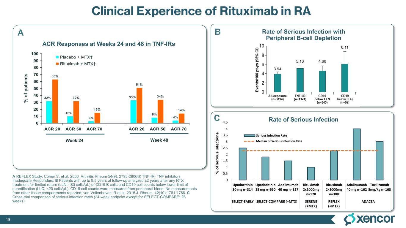 18 Unmet Needs in the Treatment of RA Current Landscape Trends • ~ 1,300,000 patients with RA in the US2 • This means that ~ 200,000 - 230,000 patients in the U.S. alone require new therapeutic options • We do not have the necessary tools to predetermine which patient will have a complete clinical response without adverse events to a specific mechanism or action or specific molecule. Survey of 25 rheumatologists1: What do they suspect will be the significant changes over the next 5 years in the treatment of RA? Convinced that bDMARDs and Jakinibs should be initiated earlier Emerging novel MoA offering improved efficacy, safety and tolerability Novel B-cell depleting therapies, CAR-T cell therapy, combination biologics, and more targeted, effective treatment options 1 Xencor survey of investigators 2 Helmick and Lawrence et al; Estimates of the prevalence of arthritis and other rheumatic conditions in the United States. Part I. Arthritis Rheum. 2008;58(1):15-25 of patients do not respond adequately or are unable to tolerate the currently approved medications1 ~15-18%