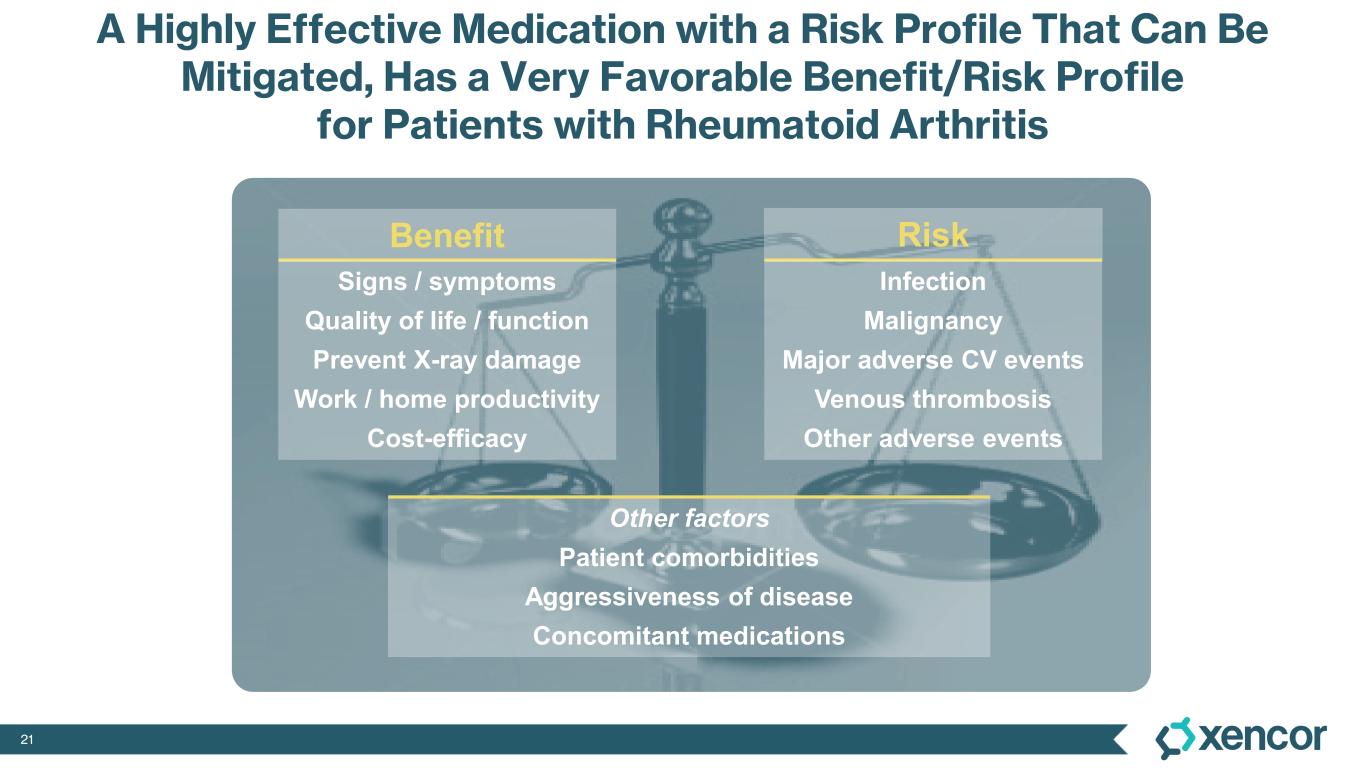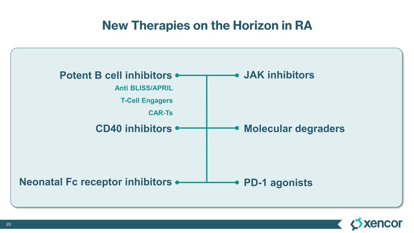 20 New Therapies on the Horizon in RA JAK inhibitors Molecular degraders Potent B cell inhibitors Anti BLISS/APRIL T-Cell Engagers CAR-Ts PD-1 agonistsNeonatal Fc receptor inhibitors CD40 inhibitors