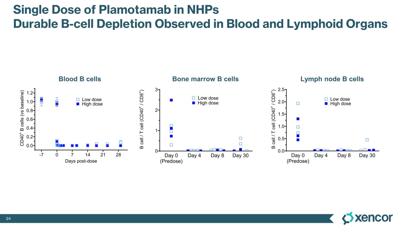 23 Plamotamab Phase 2 Ready, Subcutaneous CD20 x CD3 BsAb Positioned for SuccessXmAb® CD20 x CD3 Bispecific Design • Plamotamab designed in a 1+1 format and selected for extended activity and favorable tolerability observed in NHPs • Human half-life ~18 days; estimated 80% SC bioavailability • Robust manufacturing process with high yield and excellent formulation stability data • N=154 from dose escalation and expansion cohorts with both IV and SC formulations in B-cell cancers • Comparable preliminary efficacy data to leading commercial CD20 x CD3 in patients with prior CAR-T • IV & SC dosing regimens with improved CRS data vs. leading commercial CD20 x CD31 • Existing inventories of drug product and drug substance for seamless integration into the next phase of clinical development Bispecific Fc Domain anti-CD3 scFv anti-CD20 Fab Planned proof-of-concept for the T-cell engager class in autoimmune and inflammatory disease BsAb bispecific antibody IV intravenous, SC subcutaneous NHP non-human primate CRS cytokine release syndrome 1 No head-to-head trial has been conducted evaluating plamotamab against other data included herein. Differences exist between clinical trial design, patient populations and the product candidates themselves, and caution should be exercised when comparing data across trials.