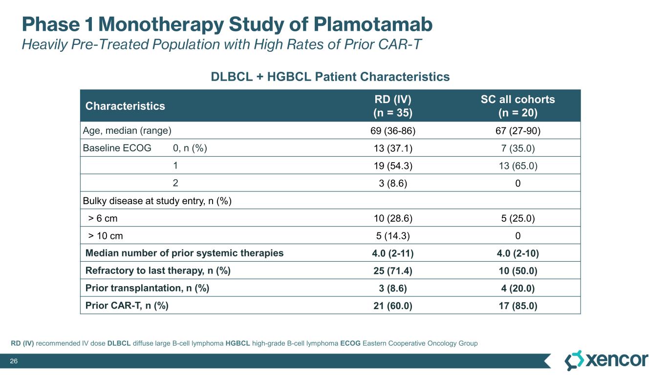 25 >95-99% Peripheral B-cell Depletion Observed in Lymphoma Patients with IV & SC Plamotamab in Phase 1 Monotherapy Study • Patients were identified (N=5) that had baseline absolute B-cell count > 30 cells/µL in the blood • >90% reductions in B-cell count also observed at lower doses Dose B -C el l L ev el R el at iv e to B as el in e Days Post Start of Treatment Relative Change in B-cell Count