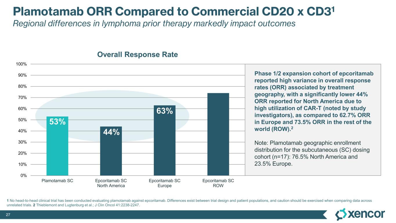 26 Phase 1 Monotherapy Study of Plamotamab Heavily Pre-Treated Population with High Rates of Prior CAR-T Characteristics RD (IV) (n = 35) SC all cohorts (n = 20) Age, median (range) 69 (36-86) 67 (27-90) Baseline ECOG 0, n (%) 13 (37.1) 7 (35.0) 1 19 (54.3) 13 (65.0) 2 3 (8.6) 0 Bulky disease at study entry, n (%) > 6 cm 10 (28.6) 5 (25.0) > 10 cm 5 (14.3) 0 Median number of prior systemic therapies 4.0 (2-11) 4.0 (2-10) Refractory to last therapy, n (%) 25 (71.4) 10 (50.0) Prior transplantation, n (%) 3 (8.6) 4 (20.0) Prior CAR-T, n (%) 21 (60.0) 17 (85.0) RD (IV) recommended IV dose DLBCL diffuse large B-cell lymphoma HGBCL high-grade B-cell lymphoma ECOG Eastern Cooperative Oncology Group DLBCL + HGBCL Patient Characteristics