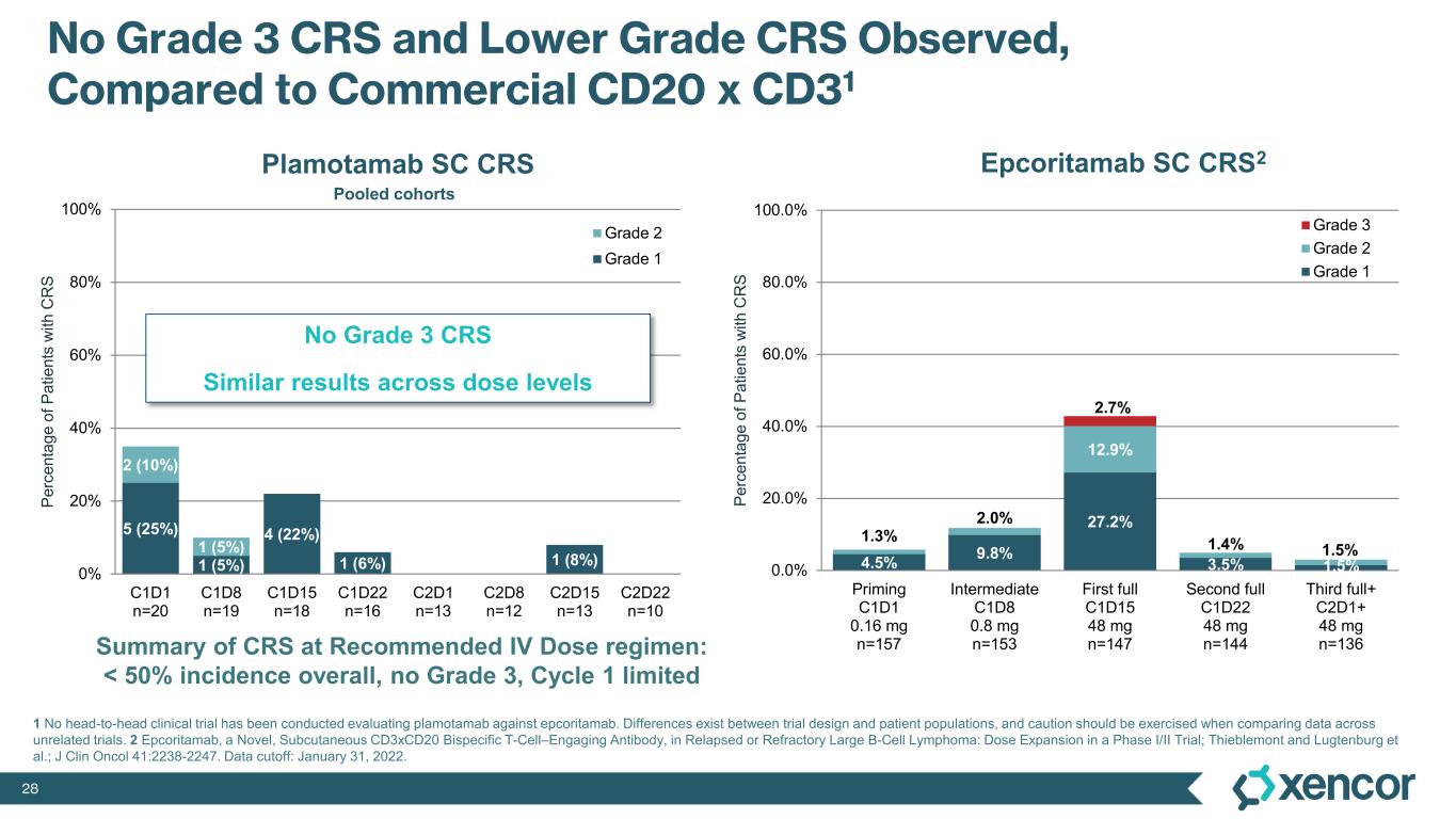 27 53% 44% 63% 0% 10% 20% 30% 40% 50% 60% 70% 80% 90% 100% Plamotamab SC Epcoritamab SC North America Epcoritamab SC Europe Epcoritamab SC ROW Plamotamab ORR Compared to Commercial CD20 x CD31 Regional differences in lymphoma prior therapy markedly impact outcomes 1 No head-to-head clinical trial has been conducted evaluating plamotamab against epcoritamab. Differences exist between trial design and patient populations, and caution should be exercised when comparing data across unrelated trials. 2 Thieblemont and Lugtenburg et al.; J Clin Oncol 41:2238-2247. Phase 1/2 expansion cohort of epcoritamab reported high variance in overall response rates (ORR) associated by treatment geography, with a significantly lower 44% ORR reported for North America due to high utilization of CAR-T (noted by study investigators), as compared to 62.7% ORR in Europe and 73.5% ORR in the rest of the world (ROW).2 Note: Plamotamab geographic enrollment distribution for the subcutaneous (SC) dosing cohort (n=17): 76.5% North America and 23.5% Europe. Overall Response Rate