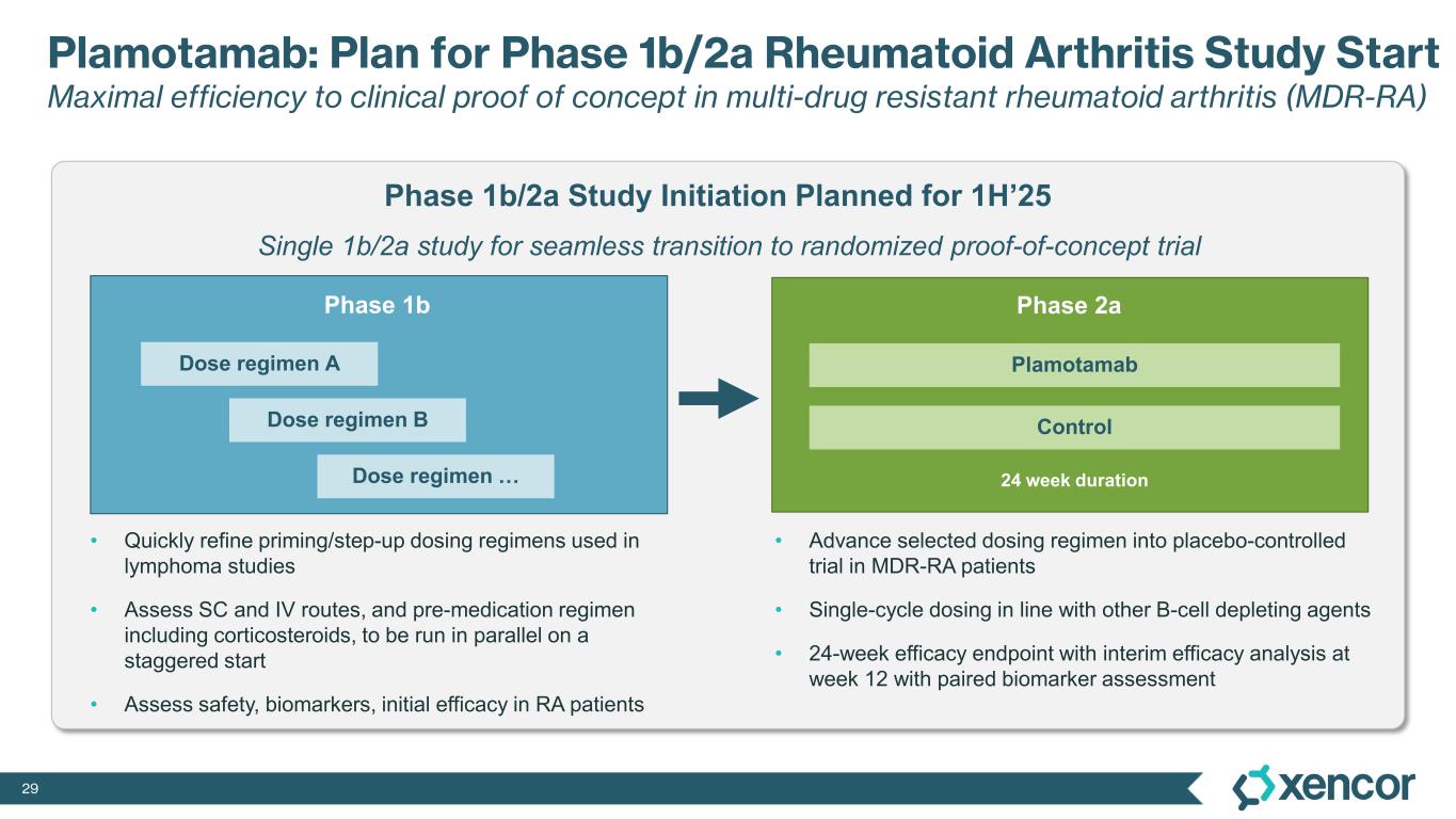 Xencor plans to initiate a Phase 1b/2a proof-of-concept study for plamotamab in MDR-RA in the first half of 2025. The Phase 1b portion of the study will select a priming and step-up dose regimen based on the regimen established in oncology, and will assess the initial safety, efficacy, and biomarkers of plamotamab in patients with MDR-RA. The selected dose regimen will then be evaluated in the randomized Phase 2a portion, with efficacy determined at week 24.