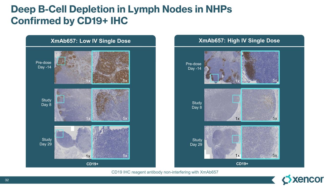 31 0 7 14 21 28 0 20 40 60 80 100 5000 10000 Days post administration B c el ls /μ L of b lo od Single Dose of XmAb657 in NHPs Deep B-cell Depletion Sustained for at Least 28 Days XmAb 657 Single IV Dose (low) XmAb657 Single IV Dose (high) * * * * * * * *** Peripheral blood 0 7 14 21 28 0 20 40 60 80 100 5000 10000 Days post administration B c el ls /μ L of b lo od 0 7 14 21 28 0 1 2 3 4 Days post administration % B c el ls a m on g ly m ph no de le uk oc yt es 0 7 14 21 28 0 1 2 3 4 5 Days post administration % B c el ls a m on g ly m ph no de le uk oc yt es 0 7 14 21 28 0 1 2 3 Days post administration % B c el ls a m on g bo ne m ar ro w le uk oc yt es Bone marrow Lymph nodes 0 7 14 21 28 0.0 0.5 1.0 1.5 2.0 Days post administration % B c el ls a m on g bo ne m ar ro w le uk oc yt es *peripheral B cells <1 B cell per µL; ‡this data point is zero B cells per µL ‡‡ ‡ B cells were gated as CD45+CD2-/lowCD20+CD4-CD8a-CD159a-