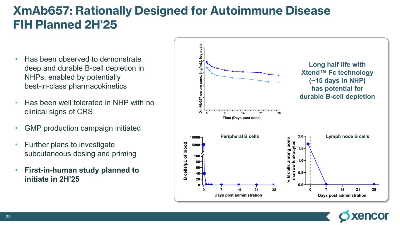 32 XmAb657: High IV Single DoseXmAb657: Low IV Single Dose Pre-dose Day -14 Study Day 8 Study Day 29 CD19+ 1x 5x 5x 5x1x 1x 1x 5x 5x 5x1x 1x Deep B-Cell Depletion in Lymph Nodes in NHPs Confirmed by CD19+ IHC Pre-dose Day -14 Study Day 8 Study Day 29 CD19+ CD19 IHC reagent antibody non-interfering with XmAb657