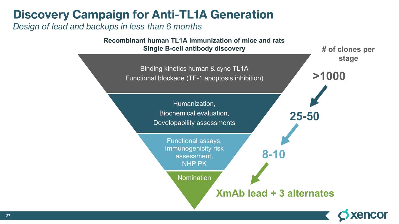 36 Development of XmAb942 and XmAb TL1A x IL-23 for IBD Phase 2 TL1A Studies and VEGA Study Support Strategy XmAb942 Design XmAb TL1A x IL-23 Design RG6631 Phase 2 TUSCANY (Roche TL1A) (cross UC study comparison of Endoscopic Improvement)1 Xtend + FcKO Bispecific Fc Domain VEGA Ph2a (Clinical Remission of UC at Week 38)2 • Building upon proof-of-concept studies with TL1A targeted therapy and combination therapies for the treatment of Ulcerative Colitis (UC) and Crohn’s Disease (CD) • Validated best-in-class Xtend half-life extension in XmAb942 • First-in-class potential of TL1A x IL-23 to target dual pathway inhibition anti-TL1A 2 Fabs anti-TL1A 1 Fab anti-IL23 1 Fab 50% 64% 37% 28% 40% RG6631 (All Comers) RG6631 (Biomarker Positive) S1P Receptor Modulator Humira Entyvio 1 Sourced from Roivant presentation of TUSCANY, Entyvio (anti-integrin) and Humira (anti-TNF) data from VARSITY P3 study, S1P receptor modulator data from ELEVATE 52 P3 study 2 Guselkumab plus golimumab combination therapy versus guselkumab or golimumab monotherapy in patients with ulcerative colitis (VEGA); Feagan and Shao et al.; The Lancet G&H; Feb 2023 48% 31% 21% Combination (anti-TNF + anti- IL23) Guselkumab (anti-IL23) Golimumab (anti- TNF) (nominal p=<0.05)