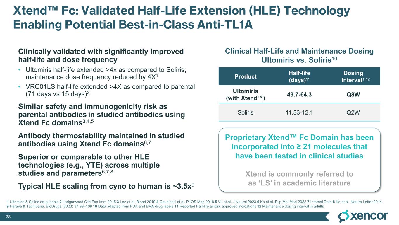 38 Xtend Fc: Validated Half-Life Extension (HLE) Technology Enabling Potential Best-in-Class Anti-TL1A Clinically validated with significantly improved half-life and dose frequency • Ultomiris half-life extended >4x as compared to Soliris; maintenance dose frequency reduced by 4X1 • VRC01LS half-life extended >4X as compared to parental (71 days vs 15 days)2 Similar safety and immunogenicity risk as parental antibodies in studied antibodies using Xtend Fc domains3,4,5 Antibody thermostability maintained in studied antibodies using Xtend Fc domains6,7 Superior or comparable to other HLE technologies (e.g., YTE) across multiple studies and parameters6,7,8 Typical HLE scaling from cyno to human is ~3.5x9 Clinical Half-Life and Maintenance Dosing Ultomiris vs. Soliris10 Product Half-life (days)11 Dosing Interval1,12 Ultomiris (with Xtend ) 49.7-64.3 Q8W Soliris 11.33-12.1 Q2W 1 Ultomiris & Soliris drug labels 2 Ledgerwood Clin Exp Imm 2015 3 Lee et al. Blood 2019 4 Gaudinski et al. PLOS Med 2018 5 Vu et al. J Neurol 2023 6 Ko et al. Exp Mol Med 2022 7 Internal Data 8 Ko et al. Nature Letter 2014 9 Haraya & Tachibana. BioDrugs (2023) 37:99–108 10 Data adapted from FDA and EMA drug labels 11 Reported Half-life across approved indications 12 Maintenance dosing interval in adults Proprietary Xtend Fc Domain has been incorporated into ≥ 21 molecules that have been tested in clinical studies Xtend is commonly referred to as ‘LS’ in academic literature