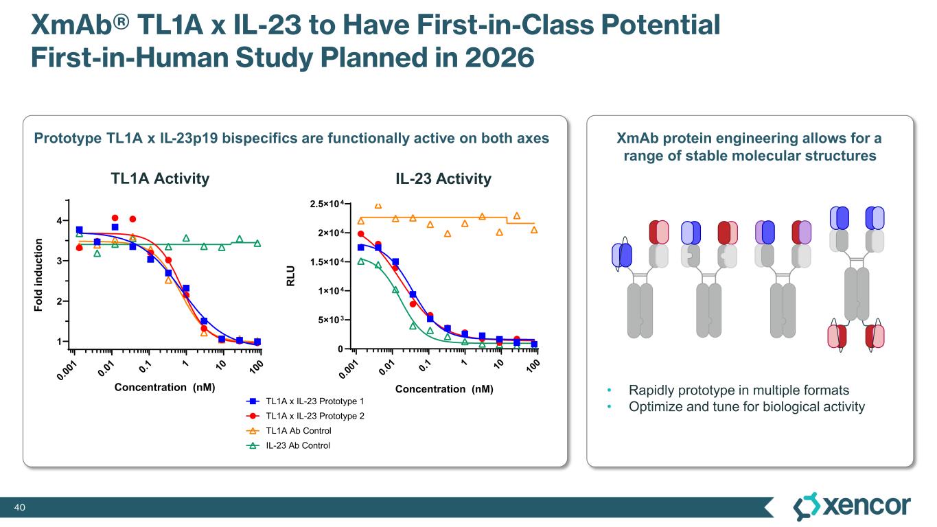 39 XmAb942: Novel High-Affinity Anti-TL1A mAb Designed for Extended Half-Life, Under Development for the Treatment of IBD • XmAb942 utilizes Xtend Fc domain technology with potentially class-leading potency • Half-life in non-human primate studies >22 days supports Q8W to Q12W dosing in humans • High concentration formulation for subcutaneous dosing • First-in-human clinical studies to begin 4Q’24 Company Program1 Potent SC Dosing Q8-12W Dosing Half-life extension Low Immunogenicity Xencor XmAb942 Merck (Prometheus)2,3 MK-7240 Roche (Roivant)4,5 RG-6631 Sanofi (Teva)6 TEV-48574 TBD Predicted Discovery & characterization of XmAb942 accepted for presentation during UEG Week on Tues., Oct. 15 1 No head-to-head trial has been conducted evaluating XmAb942 against other data included herein. Differences exist between clinical trial design, patient populations and the product candidates themselves, and caution should be exercised when comparing data across trials 2 PRA023 Progress Update (Prometheus presentation) 3 Feagan et al. The Anti-TL1A Antibody PRA023 Demonstrated Proof-of-Concept in Crohn’s Disease: Phase 2a APOLLO-CD Study Results (DOP87) Abstract citation ID: jjac190.0127 4 Banfield et al. Br J Clin Pharmacol. 2020;86:812–824 5 Clarke et al. mAbs. 2018;10:4, 664-677 6 Danese et al. Clin Gastroenterology and Hepatology. 2021;19:11, 2324-32.e6