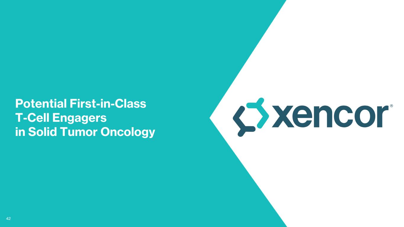 41 Xencor Positioned for Best-in-Class TL1A Portfolio in $23bn+ Global IBD Market1 Tulisokibart2,3 ≈ 2027 IV Induction and Q4W Dosing with Less Potency1st RG66314,5 TEV-485746 XmAb942 (Xtend TL1A) XmAb® TL1A x IL23 Q4W Dosing and High Rate of Immunogenicity2nd Q8W+ SC Dosing with Leading PotencyBest-in-Class Next-Gen TL1A Timelines are illustrative only and subject to FDA approvals 1 Estimate of US, UK, Spain, Japan, Italy, Germany, France and Canada market size in 2030 (GlobalData) 2 PRA023 Progress Update (Prometheus presentation) 3 Feagan et al. The Anti-TL1A Antibody PRA023 Demonstrated Proof-of-Concept in Crohn’s Disease: Phase 2a APOLLO-CD Study Results (DOP87) Abstract citation ID: jjac190.0127 4 Banfield et al. Br J Clin Pharmacol. 2020;86:812–824 5 Clarke et al. mAbs. 2018;10:4, 664-677 6 Danese et al. Clin Gastroenterology and Hepatology. 2021;19:11, 2324-32.e6 2QW-4QW Dosing with Limited Efficacy Data in IBD3rd Dual-Blocked TL1A & IL-23 in Single Drug Product First-in-Class TL1A Bispecific Potential Commercializations for First-Gen Programs and XmAb® TL1A Portfolio