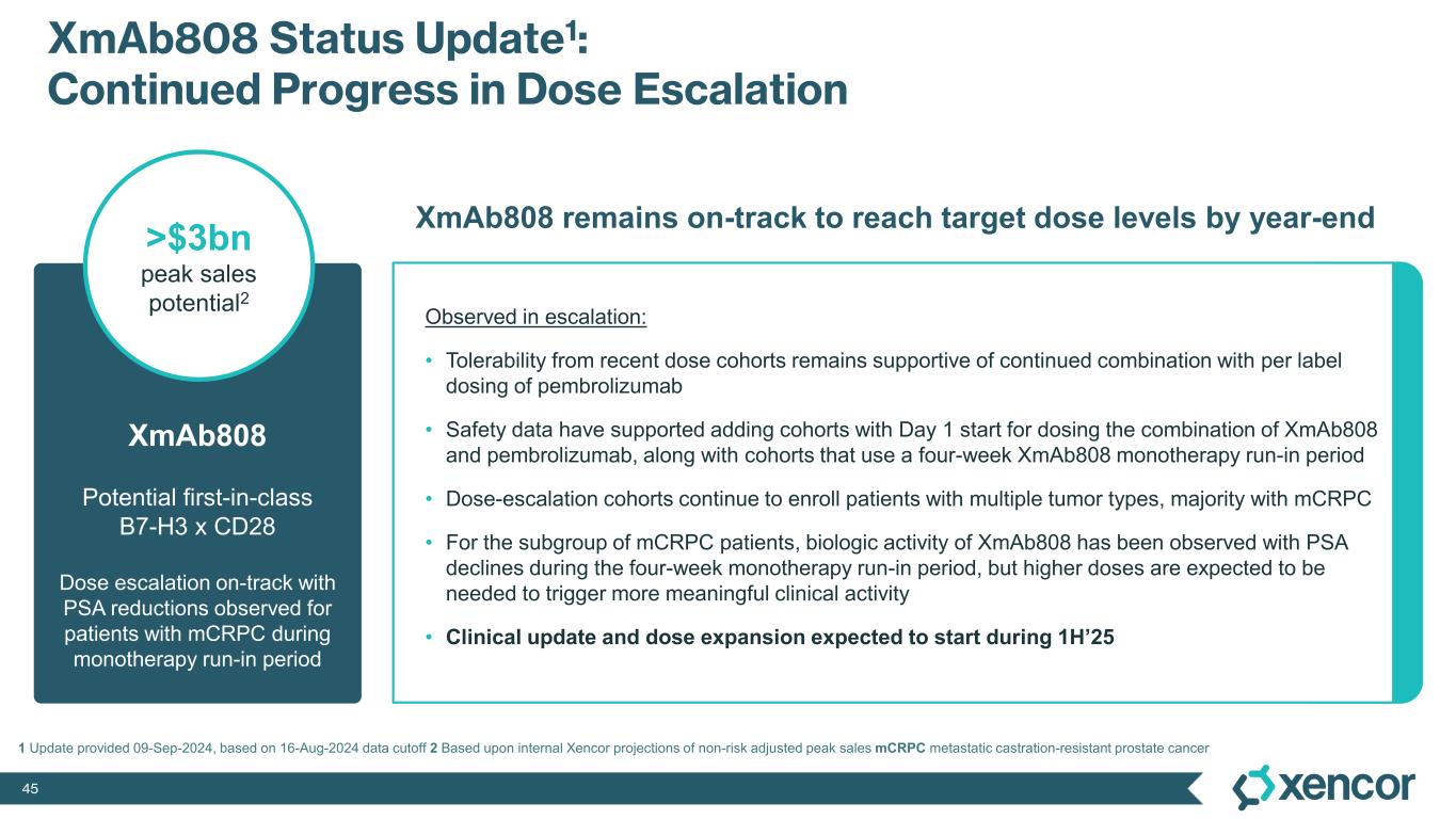 44 XmAb819 Status Update1: Encouraging Initial Data in Ongoing Dose Escalation in ccRCC XmAb819 Potential first-in-class ENPP3 x CD3 Dose escalation on-track with RECIST responses in recent dose cohorts >$2bn peak sales potential in ccRCC2 1 Update provided 09-Sep-2024, based on 30-Aug-2024 data cutoff 2 Based upon internal Xencor projections of non-risk adjusted peak sales ccRCC clear cell renal cell carcinoma MTD maximum tolerated dose Observed in escalation: • Clear initial evidence of anti-tumor activity, including RECIST responses, in recent cohorts • Duration of treatment for several patients in earlier dose cohorts has extended beyond one year • Cytokine release syndrome (CRS) manageable • No MTD reached; tolerability from recent dose cohorts continues to support dose escalation XmAb819 remains on-track to reach target dose levels by year-end • Investigators remain highly engaged, and enrollment into new dose cohorts has been rapid • Intravenous and subcutaneous cohorts continue dose escalation in parallel • Evaluation of expansion into additional tumor types is ongoing • Clinical update and first dose expansion cohort expected to start during 1H’25