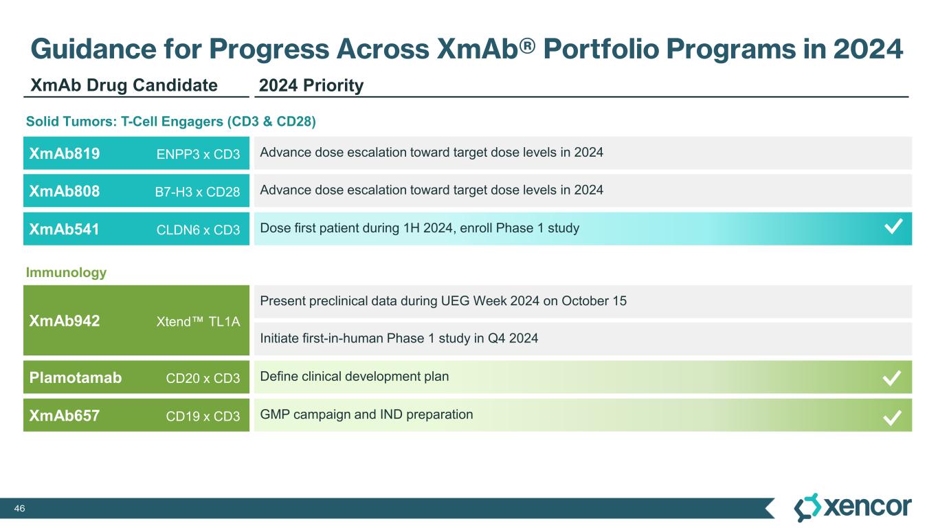 45 XmAb808 Status Update1: Continued Progress in Dose Escalation Observed in escalation: • Tolerability from recent dose cohorts remains supportive of continued combination with per label dosing of pembrolizumab • Safety data have supported adding cohorts with Day 1 start for dosing the combination of XmAb808 and pembrolizumab, along with cohorts that use a four-week XmAb808 monotherapy run-in period • Dose-escalation cohorts continue to enroll patients with multiple tumor types, majority with mCRPC • For the subgroup of mCRPC patients, biologic activity of XmAb808 has been observed with PSA declines during the four-week monotherapy run-in period, but higher doses are expected to be needed to trigger more meaningful clinical activity • Clinical update and dose expansion expected to start during 1H’25 XmAb808 Potential first-in-class B7-H3 x CD28 Dose escalation on-track with PSA reductions observed for patients with mCRPC during monotherapy run-in period >$3bn peak sales potential2 1 Update provided 09-Sep-2024, based on 16-Aug-2024 data cutoff 2 Based upon internal Xencor projections of non-risk adjusted peak sales mCRPC metastatic castration-resistant prostate cancer XmAb808 remains on-track to reach target dose levels by year-end