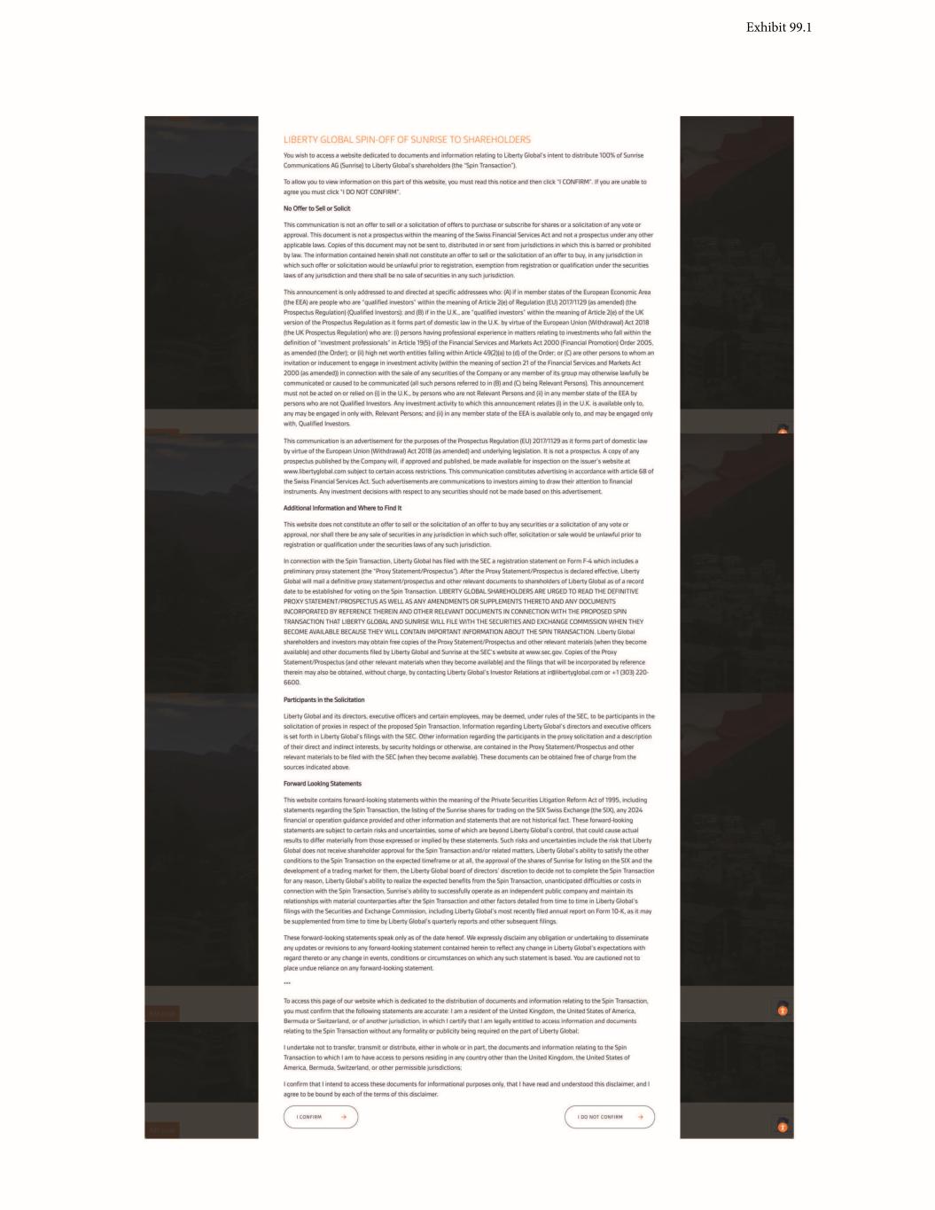 This press release contains forward-looking statements within the meaning of the Private Securities Litigation Reform Act of 1995, including statements regarding the Transaction, the listing of the Sunrise shares for trading on the SIX Swiss Exchange (the SIX), any 2024 financial or operation guidance provided and other information and statements that are not historical fact. These forward-looking statements are subject to certain risks and uncertainties, some of which are beyond Liberty Global’s and Sunrise’s control, that could cause actual results to differ materially from those expressed or implied by these statements. Such risks and uncertainties include the risk that Liberty Global does not receive shareholder approval for the Transaction and/or related matters, Liberty Global’s ability to satisfy the other conditions to the Transaction on the expected timeframe or at all, the approval of the shares of Sunrise for listing on the SIX and the development of a trading market for them, the Liberty Global Board of Directors’ discretion to decide not to complete the Transaction for any reason, Liberty Global’s ability to realize the expected benefits from the Transaction, unanticipated difficulties or costs in connection with the Transaction, Sunrise’s ability to successfully operate as an independent public company and maintain its relationships with material counterparties after the Transaction and other factors detailed from time to time in Liberty Global’s or Sunrise’s filings with the Securities and Exchange Commission, including Liberty Global’s most recently filed annual report on Form 10-K, as it may be supplemented from time to time by Liberty Global’s quarterly reports and other subsequent filings.