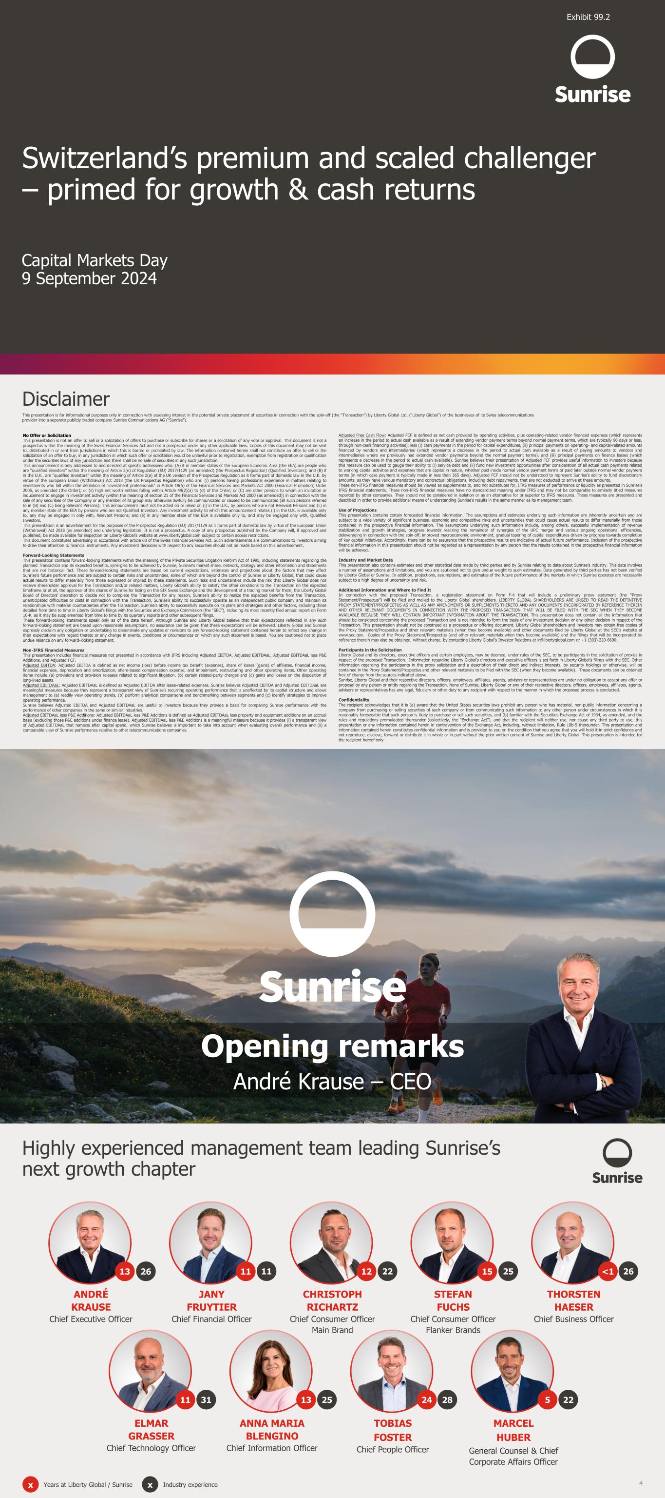 1 Switzerland’s premium and scaled challenger – primed for growth & cash returns Capital Markets Day 9 September 2024 Exhibit 99.2 2 Disclaimer No Offer or Solicitation This presentation is not an offer to sell or a solicitation of offers to purchase or subscribe for shares or a solicitation of any vote or approval. This document is not a prospectus within the meaning of the Swiss Financial Services Act and not a prospectus under any other applicable laws. Copies of this document may not be sent to, distributed in or sent from jurisdictions in which this is barred or prohibited by law. The information contained herein shall not constitute an offer to sell or the solicitation of an offer to buy, in any jurisdiction in which such offer or solicitation would be unlawful prior to registration, exemption from registration or qualification under the securities laws of any jurisdiction and there shall be no sale of securities in any such jurisdiction. This announcement is only addressed to and directed at specific addressees who: (A) if in member states of the European Economic Area (the EEA) are people who are “qualified investors” within the meaning of Article 2(e) of Regulation (EU) 2017/1129 (as amended) (the Prospectus Regulation) (Qualified Investors); and (B) if in the U.K., are “qualified investors” within the meaning of Article 2(e) of the UK version of the Prospectus Regulation as it forms part of domestic law in the U.K. by virtue of the European Union (Withdrawal) Act 2018 (the UK Prospectus Regulation) who are: (i) persons having professional experience in matters relating to investments who fall within the definition of “investment professionals” in Article 19(5) of the Financial Services and Markets Act 2000 (Financial Promotion) Order 2005, as amended (the Order); or (ii) high net worth entities falling within Article 49(2)(a) to (d) of the Order; or (C) are other persons to whom an invitation or inducement to engage in investment activity (within the meaning of section 21 of the Financial Services and Markets Act 2000 (as amended)) in connection with the sale of any securities of the Company or any member of its group may otherwise lawfully be communicated or caused to be communicated (all such persons referred to in (B) and (C) being Relevant Persons). This announcement must not be acted on or relied on (i) in the U.K., by persons who are not Relevant Persons and (ii) in any member state of the EEA by persons who are not Qualified Investors. Any investment activity to which this announcement relates (i) in the U.K. is available only to, any may be engaged in only with, Relevant Persons; and (ii) in any member state of the EEA is available only to, and may be engaged only with, Qualified Investors. This presentation is an advertisement for the purposes of the Prospectus Regulation (EU) 2017/1129 as it forms part of domestic law by virtue of the European Union (Withdrawal) Act 2018 (as amended) and underlying legislation. It is not a prospectus. A copy of any prospectus published by the Company will, if approved and published, be made available for inspection on Liberty Global’s website at www.libertyglobal.com subject to certain access restrictions. This document constitutes advertising in accordance with article 68 of the Swiss Financial Services Act. Such advertisements are communications to investors aiming to draw their attention to financial instruments. Any investment decisions with respect to any securities should not be made based on this advertisement. Forward-Looking Statements This presenation contains forward-looking statements within the meaning of the Private Securities Litigation Reform Act of 1995, including statements regarding the planned Transaction and its expected benefits, synergies to be achieved by Sunrise, Sunrise’s market share, network, strategy and other information and statements that are not historical fact. These forward-looking statements are based on current expectations, estimates and projections about the factors that may affect Sunrise’s future performance and are subject to certain risks and uncertainties, some of which are beyond the control of Sunrise or Liberty Global, that could cause actual results to differ materially from those expressed or implied by these statements. Such risks and uncertainties include the risk that Liberty Global does not receive shareholder approval for the Transaction and/or related matters, Liberty Global’s ability to satisfy the other conditions to the Transaction on the expected timeframe or at all, the approval of the shares of Sunrise for listing on the SIX Swiss Exchange and the development of a trading market for them, the Liberty Global Board of Directors’ discretion to decide not to complete the Transaction for any reason, Sunrise’s ability to realize the expected benefits from the Transaction, unanticipated difficulties or costs in connection with the Transaction, Sunrise’s ability to successfully operate as an independent public company and maintain its relationships with material counterparties after the Transaction, Sunrise’s ability to successfully execute on its plans and strategies and other factors, including those detailed from time to time in Liberty Global’s filings with the Securities and Exchange Commission (the “SEC”), including its most recently filed annual report on Form 10-K, as it may be supplemented from time to time by its quarterly reports and other subsequent filings. These forward-looking statements speak only as of the date hereof. Although Sunrise and Liberty Global believe that their expectations reflected in any such forward-looking statement are based upon reasonable assumptions, no assurance can be given that these expectations will be achieved. Liberty Global and Sunrise expressly disclaim any obligation or undertaking to disseminate any updates or revisions to any forward-looking statement contained herein to reflect any change in the