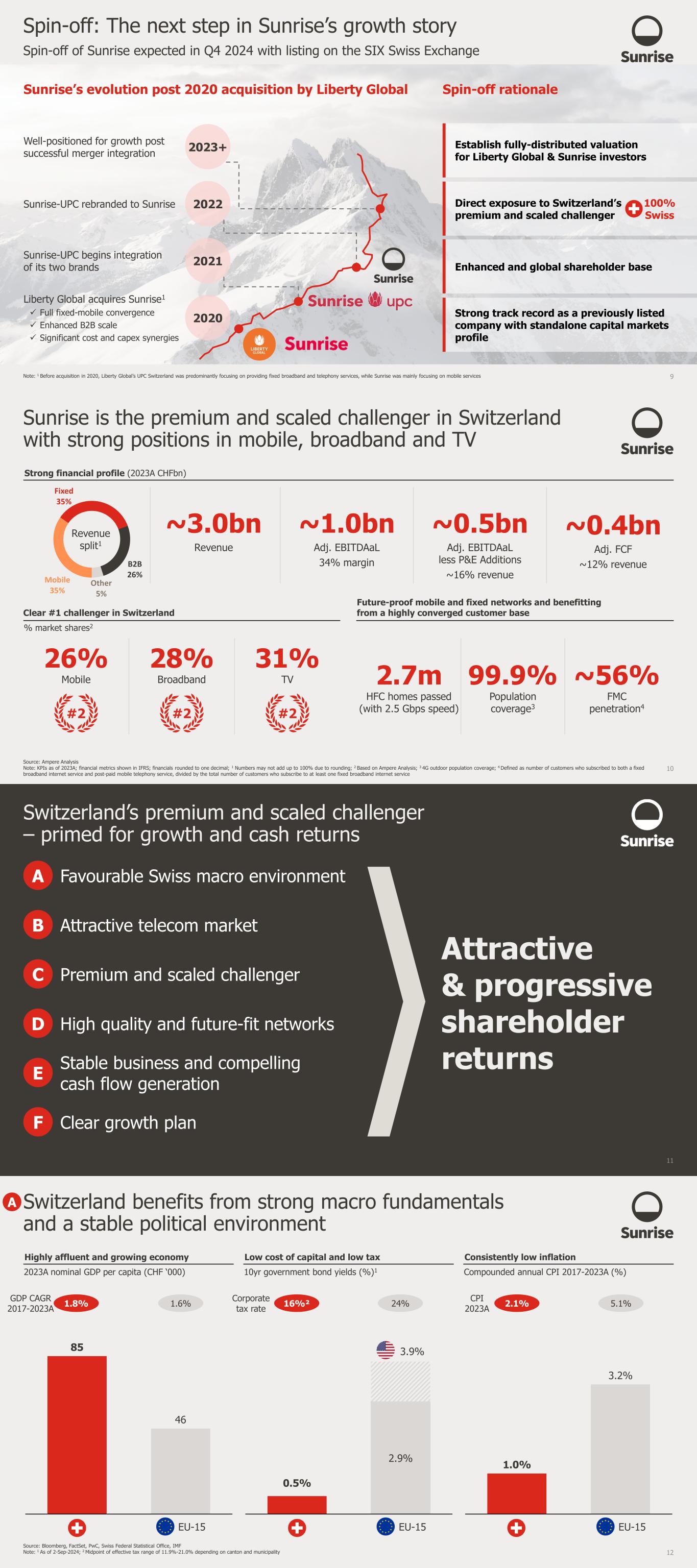 9 Spin-off: The next step in Sunrise’s growth story Spin-off of Sunrise expected in Q4 2024 with listing on the SIX Swiss Exchange 2023+ Liberty Global acquires Sunrise1 ✓ Full fixed-mobile convergence ✓ Enhanced B2B scale ✓ Significant cost and capex synergies Well-positioned for growth post successful merger integration Sunrise-UPC rebranded to Sunrise Sunrise-UPC begins integration of its two brands 2022 2021 2020 Spin-off rationaleSunrise’s evolution post 2020 acquisition by Liberty Global Note: 1 Before acquisition in 2020, Liberty Global’s UPC Switzerland was predominantly focusing on providing fixed broadband and telephony services, while Sunrise was mainly focusing on mobile services Establish fully-distributed valuation for Liberty Global & Sunrise investors Direct exposure to Switzerland’s premium and scaled challenger Enhanced and global shareholder base Strong track record as a previously listed company with standalone capital markets profile 100% Swiss 10 99.9% Population coverage3 26% Mobile 28% Broadband 31% TV Mobile 35% Fixed 35% B2B 26% Other 5% Sunrise is the premium and scaled challenger in Switzerland with strong positions in mobile, broadband and TV Revenue split1 Source: Ampere Analysis Note: KPIs as of 2023A; financial metrics shown in IFRS; financials rounded to one decimal; 1 Numbers may not add up to 100% due to rounding; 2 Based on Ampere Analysis; 3 4G outdoor population coverage; 4 Defined as number of customers who subscribed to both a fixed broadband internet service and post-paid mobile telephony service, divided by the total number of customers who subscribe to at least one fixed broadband internet service Clear #1 challenger in Switzerland Future-proof mobile and fixed networks and benefitting from a highly converged customer base ~3.0bn Revenue ~1.0bn Adj. EBITDAaL 34% margin ~0.5bn Adj. EBITDAaL less P&E Additions ~16% revenue ~0.4bn Adj. FCF ~12% revenue #2 #2 #2 Strong financial profile (2023A CHFbn) % market shares2 2.7m HFC homes passed (with 2.5 Gbps speed) ~56% FMC penetration4 11 Switzerland’s premium and scaled challenger – primed for growth and cash returns it rl ’ r i l ll r ri f r r t r t r A B C D E F Favourable Swiss macro environment Attractive & progressive shareholder returns Attractive telecom market Premium and scaled challenger High quality and future-fit networks Stable business and compelling cash flow generation Clear growth plan 12 1.0% 3.2% 0.5% 2.9% 3.9% Switzerland benefits from strong macro fundamentals and a stable political environment 10yr government bond yields (%)1 Corporate tax rate GDP CAGR 2017-2023A Compounded annual CPI 2017-2023A (%) CPI 2023A 2023A nominal GDP per capita (CHF ‘000) 85 46 1.8% 1.6% 2.1% 5.1% EU-15 EU-15 EU-15 A 16%² 24% Highly affluent and growing economy Low cost of capital and low tax Consistently low inflation Source: Bloomberg, FactSet, PwC, Swiss Federal Statistical Office, IMF Note: 1 As of 2-Sep-2024; 2 Midpoint of effective tax range of 11.9%-21.0% depending on canton and municipality