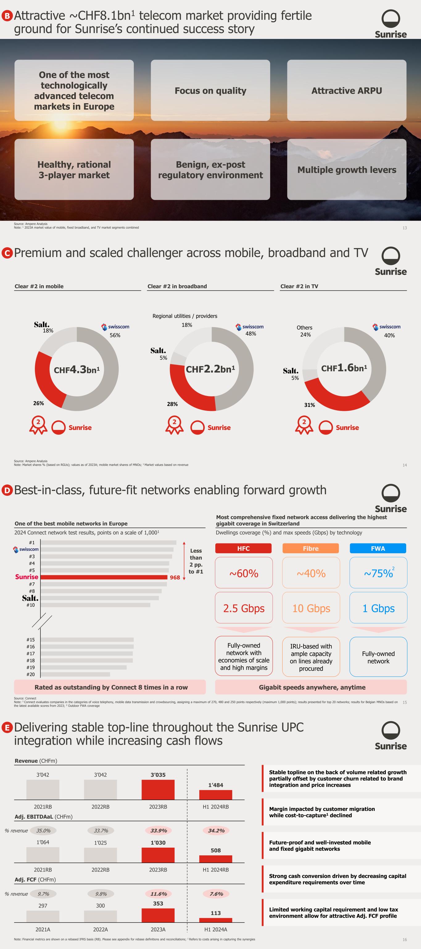 13 Attractive ~CHF8.1bn1 telecom market providing fertile ground for Sunrise’s continued success story One of the most technologically advanced telecom markets in Europe Focus on quality Attractive ARPU Healthy, rational 3-player market Benign, ex-post regulatory environment Multiple growth levers B Source: Ampere Analysis Note: 1 2023A market value of mobile, fixed broadband, and TV market segments combined 14 48% 28% 5% 18% 56% 26% 18% 40% 31% 5% 24% Source: Ampere Analysis Note: Market shares % (based on RGUs); values as of 2023A; mobile market shares of MNOs; 1 Market values based on revenue Premium and scaled challenger across mobile, broadband and TV CHF4.3bn1 CHF2.2bn1 CHF1.6bn1 Others C Clear #2 in mobile Clear #2 in broadband Clear #2 in TV 2 2 2 Regional utilities / providers 15 Source: Connect Note: 1 Connect evaluates companies in the categories of voice telephony, mobile data transmission and crowdsourcing, assigning a maximum of 270, 480 and 250 points respectively (maximum 1,000 points); results presented for top 20 networks; results for Belgian MNOs based on the latest available scores from 2023; 2 Outdoor FWA coverage Best-in-class, future-fit networks enabling forward growth One of the best mobile networks in Europe Most comprehensive fixed network access delivering the highest gigabit coverage in Switzerland D Fully-owned network with economies of scale and high margins 968 #1 #2 #3 #4 #5 #6 #7 #8 #9 #10 #15 #16 #17 #18 #19 #20 Less than 2 pp. to #1 Gigabit speeds anywhere, anytime IRU-based with ample capacity on lines already procured Fully-owned network 2.5 Gbps 10 Gbps 1 Gbps HFC Fibre FWA ~60% ~75%~40% Dwellings coverage (%) and max speeds (Gbps) by technology2024 Connect network test results, points on a scale of 1,0001 Rated as outstanding by Connect 8 times in a row 2 16 3’042 3’042 3’035 1’484 2021RB 2022RB 2023RB H1 2024RB Delivering stable top-line throughout the Sunrise UPC integration while increasing cash flows Note: Financial metrics are shown on a rebased IFRS basis (RB). Please see appendix for rebase definitions and reconciliations; 1 Refers to costs arising in capturing the synergies % revenue 1’064 1’025 1’030 508 2021RB 2022RB 2023RB H1 2024RB 35.0% 33.7% 33.9% % revenue 297 300 353 113 2021A 2022A 2023A H1 2024A 9.7% 9.8% 11.6% E 34.2% 7.6% Revenue (CHFm) Stable topline on the back of volume related growth partially offset by customer churn related to brand integration and price increases Margin impacted by customer migration while cost-to-capture1 declined Future-proof and well-invested mobile and fixed gigabit networks Strong cash conversion driven by decreasing capital expenditure requirements over time Limited working capital requirement and low tax environment allow for attractive Adj. FCF profile Adj. EBITDAaL (CHFm) Adj. FCF (CHFm)