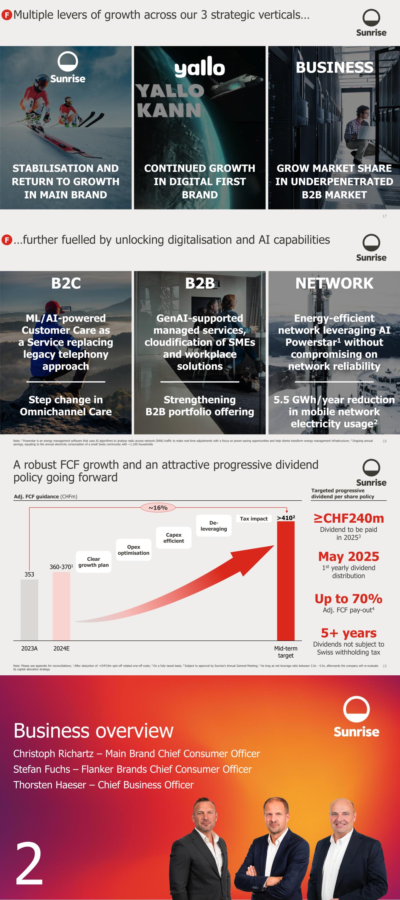 17 Multiple levers of growth across our 3 strategic verticals…F GROW MARKET SHARE IN UNDERPENETRATED B2B MARKET BUSINESS STABILISATION AND RETURN TO GROWTH IN MAIN BRAND CONTINUED GROWTH IN DIGITAL FIRST BRAND 18 …further fuelled by unlocking digitalisation and AI capabilitiesF Note: 1 Powerstar is an energy management software that uses AI algorithms to analyse radio access network (RAN) traffic to make real-time adjustments with a focus on power-saving opportunities and help clients transform energy management infrastructure; 2 Ongoing annual savings, equating to the annual electricity consumption of a small Swiss community with ~1,100 households NETWORKB2BB2C ML/AI-powered Customer Care as a Service replacing legacy telephony approach GenAI-supported managed services, cloudification of SMEs and workplace solutions Energy-efficient network leveraging AI Powerstar1 without compromising on network reliability Step change in Omnichannel Care Strengthening B2B portfolio offering 5.5 GWh/year reduction in mobile network electricity usage2 19 A robust FCF growth and an attractive progressive dividend policy going forward Note: Please see appendix for reconciliations; 1 After deduction of ~CHF10m spin-off related one-off costs; 2 On a fully taxed basis; 3 Subject to approval by Sunrise’s Annual General Meeting; 4 As long as net leverage ratio between 3.5x - 4.5x, afterwards the company will re-evaluate its capital allocation strategy ≥CHF240m Dividend to be paid in 20253 May 2025 1st yearly dividend distribution Up to 70% Adj. FCF pay-out4 353 360-3701 >4102 2023A 2024E Mid-term target Clear growth plan Opex optimisation Capex efficient De- leveraging ~16% Adj. FCF guidance (CHFm) Targeted progressive dividend per share policy Tax impact 5+ years Dividends not subject to Swiss withholding tax Business overview Christoph Richartz – Main Brand Chief Consumer Officer Stefan Fuchs – Flanker Brands Chief Consumer Officer Thorsten Haeser – Chief Business Officer 2