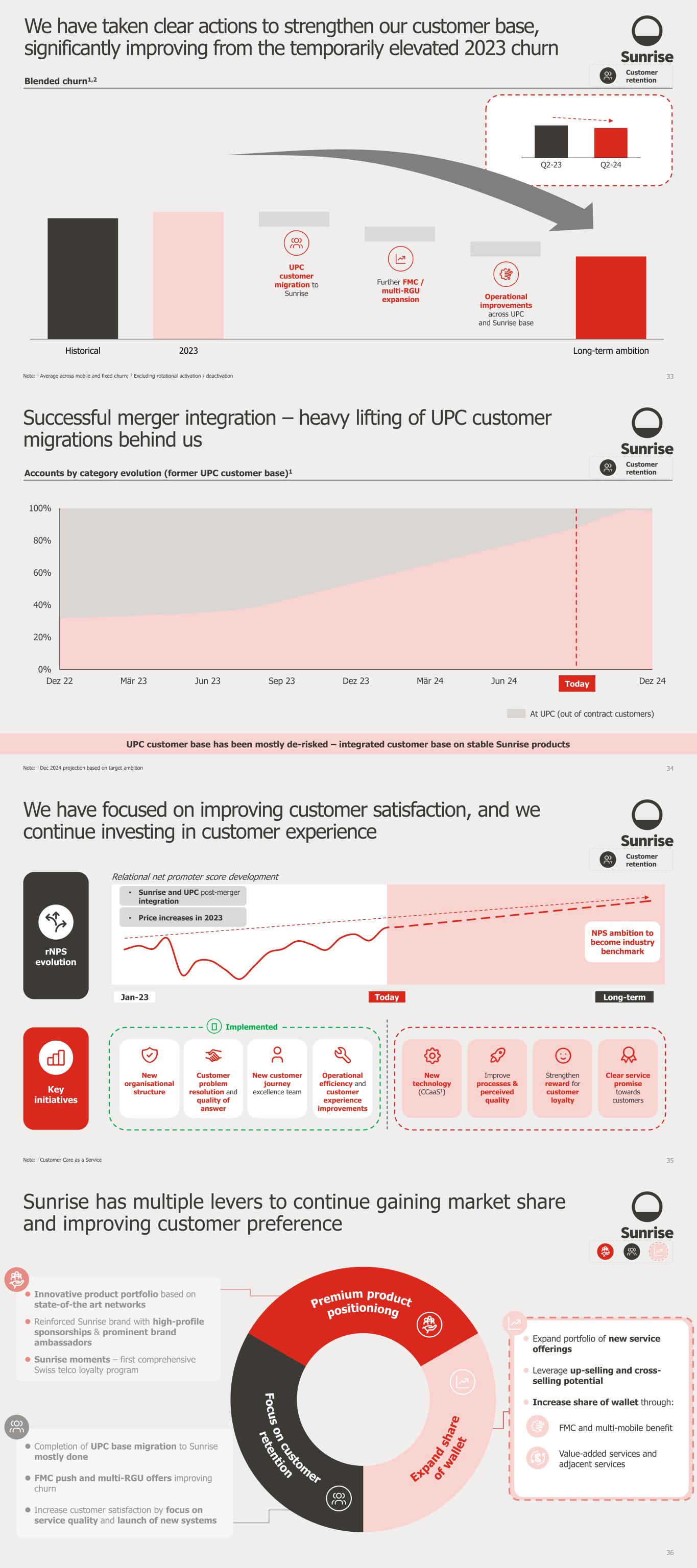Note: 1 Average across mobile and fixed churn; 2 Excluding rotational activation / deactivation Historical 2023 Initiative 1 Initiative 2 Initiative 3 Long-term ambition Blended churn1,2 Further FMC / multi-RGU expansion UPC customer migration to Sunrise Operational improvements across UPC and Sunrise base Q2-23 Q2-24 We have taken clear actions to strengthen our customer base, significantly improving from the temporarily elevated 2023 churn Customer retention 33 UPC customer base has been mostly de-risked – integrated customer base on stable Sunrise products 0% 20% 40% 60% 80% 100% Dez 22 Mär 23 Jun 23 Sep 23 Dez 23 Mär 24 Jun 24 Sep 24 Dez 24 Successful merger integration – heavy lifting of UPC customer migrations behind us Note: 1 Dec 2024 projection based on target ambition Today At UPC (out of contract customers) Customer retentionAccounts by category evolution (former UPC customer base)1 34 We have focused on improving customer satisfaction, and we continue investing in customer experience rNPS evolution Key initiatives TodayJan-23 Long-term New technology (CCaaS1) Improve processes & perceived quality Strengthen reward for customer loyalty Clear service promise towards customers Customer problem resolution and quality of answer New organisational structure New customer journey excellence team Operational efficiency and customer experience improvements Implemented • Sunrise and UPC post-merger integration • Price increases in 2023 NPS ambition to become industry benchmark Customer retention Relational net promoter score development Note: 1 Customer Care as a Service 35 ⚫ Innovative product portfolio based on state-of-the art networks ⚫ Reinforced Sunrise brand with high-profile sponsorships & prominent brand ambassadors ⚫ Sunrise moments – first comprehensive Swiss telco loyalty program Sunrise has multiple levers to continue gaining market share and improving customer preference ⚫ Expand portfolio of new service offerings ⚫ Leverage up-selling and cross- selling potential ⚫ Increase share of wallet through: o FMC and multi-mobile benefit o Value-added services and adjacent services ⚫ Completion of UPC base migration to Sunrise mostly done ⚫ FMC push and multi-RGU offers improving churn ⚫ Increase customer satisfaction by focus on service quality and launch of new systems F o c u s o n cu stom er re te n tion Expan d sh a re of w a ll e t Premium product positioniong 36