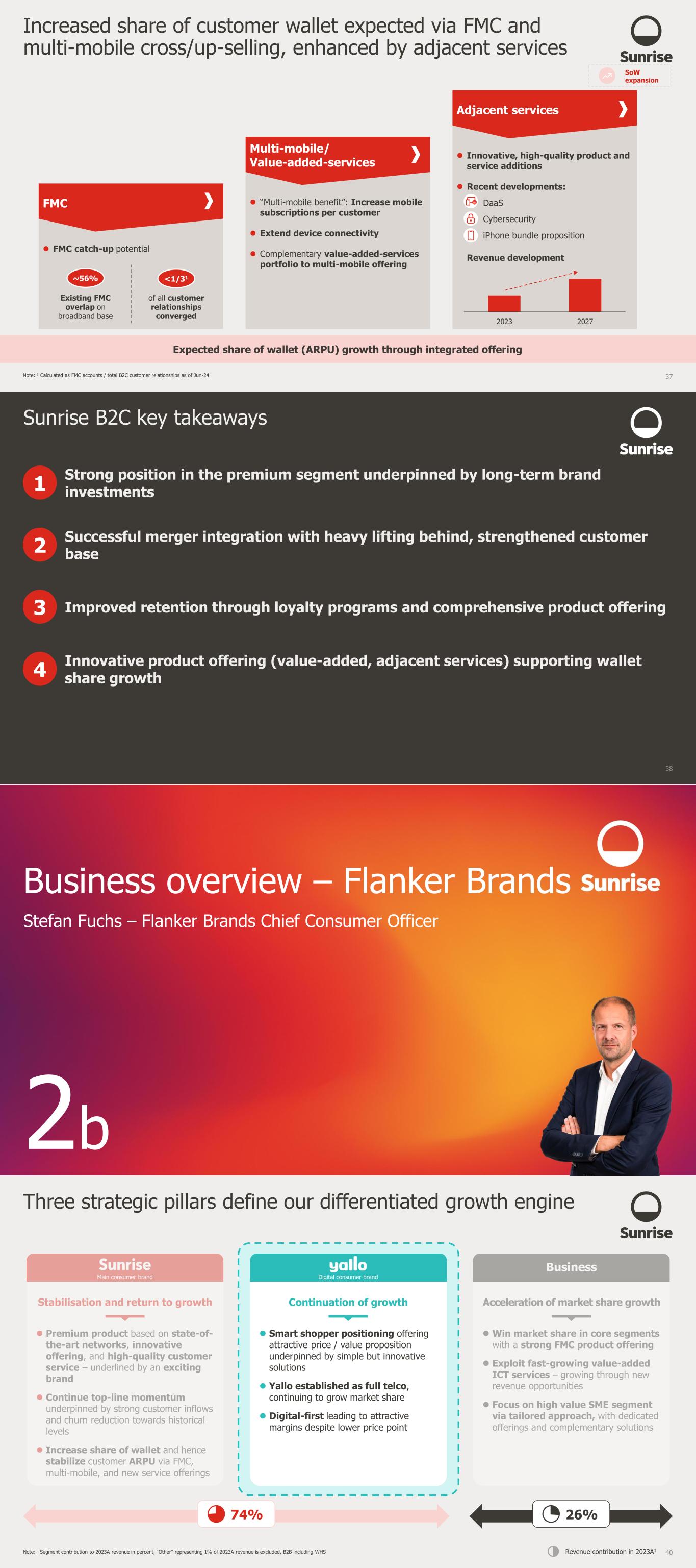 21 Our strategy is underpinned by well-defined targets to deliver Sunrise’s long-term vision GAIN MARKET SHARE IN CORE SEGMENT DEVELOP MORE RGU’S & EXTRA OPTIONS PER CUSTOMER DEVELOP NEW ADJACENT SERVICES FOR FURTHER GROWTH Leading fully-converged challenger Gross adds, FMC, multi-mobile Value-added services 22 Strong portfolio of brands support leading challenger position, strategically addressing each market segment High Low HighPerceived value Premium segment Smart shopper segment Budget segmentLow P e rc e iv e d p ri c e 55-65% 30-40% <5% Note: 1 Based on Sunrise estimates Estimated % of market1% • Main brand - strong challenger of Swisscom • Well-established premium position • High quality network • No-frills and digital first • Dynamic pricing • Attractive economics MVNOs / branded resellers Flanker brands Our multi-brand strategy targets different segments of the market Brand proposition Note: 1 Segment contribution to 2023A revenue in percent, “Other” representing 1% of 2023A revenue is excluded, B2B including WHS Continuation of growth ⚫ Smart shopper positioning offering attractive price / value proposition underpinned by simple but innovative solutions ⚫ Yallo established as full telco, continuing to grow market share ⚫ Digital-first leading to attractive margins despite lower price point Digital consumer brand Three strategic pillars define our differentiated growth engine Stabilisation and return to growth ⚫ Premium product based on state-of- the-art networks, innovative offering, and high-quality customer service – underlined by an exciting brand ⚫ Continue top-line momentum underpinned by strong customer inflows and churn reduction towards historical levels ⚫ Increase share of wallet and hence stabilize customer ARPU via FMC, multi-mobile, and new service offerings Main consumer brand Acceleration of market share growth ⚫ Win market share in core segments with a strong FMC product offering ⚫ Exploit fast-growing value-added ICT services – growing through new revenue opportunities ⚫ Focus on high value SME segment via tailored approach, with dedicated offerings and complementary solutions Business 74% 26% Revenue contribution in 2023A1 23 Business overview – Main Brand Christoph Richartz – Main Brand Chief Consumer Officer 2a