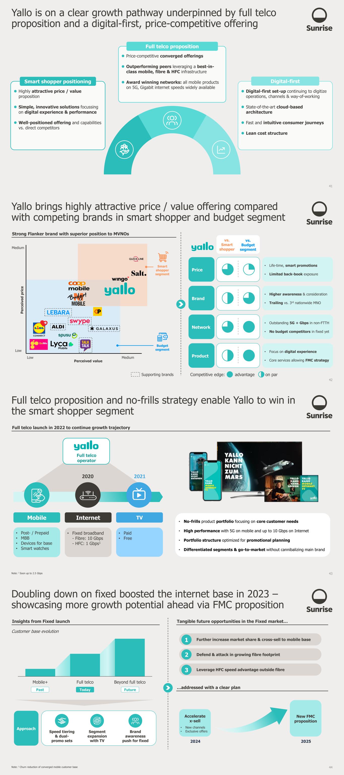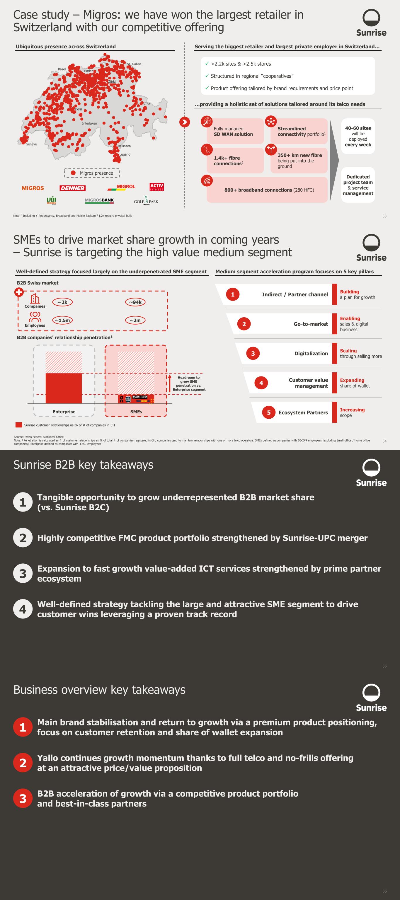 Note: 1 Including Y-Redundancy, Broadband and Mobile Backup; 2 1.2k require physical build Case study – Migros: we have won the largest retailer in Switzerland with our competitive offering ✓ >2.2k sites & >2.5k stores ✓ Structured in regional “cooperatives” ✓ Product offering tailored by brand requirements and price point 40-60 sites will be deployed every week Dedicated project team & service management Fully managed SD WAN solution Streamlined connectivity portfolio1 1.4k+ fibre connections2 350+ km new fibre being put into the ground 800+ broadband connections (280 HFC) Ubiquitous presence across Switzerland Basel St. Gallen Baden Zürich Lugano Genève Bern Chur Bellinzoa Interlaken Migros presence Serving the biggest retailer and largest private employer in Switzerland… …providing a holistic set of solutions tailored around its telco needs 53 Source: Swiss Federal Statistical Office Note: 1 Penetration is calculated as # of customer relationships as % of total # of companies registered in CH; companies tend to maintain relationships with one or more telco operators. SMEs defined as companies with 10-249 employees (excluding Small office / Home office companies), Enterprise defined as companies with +250 employees 1 Building a plan for growth Enabling sales & digital business Scaling through selling more Expanding share of wallet Increasing scope Indirect / Partner channel Go-to-market Digitalization Customer value management Ecosystem Partners 2 3 4 5 Medium segment acceleration program focuses on 5 key pillars B2B companies' relationship penetration1 Sunrise customer relationships as % of # of companies in CH SMEs Headroom to grow SME penetration vs. Enterprise segment Enterprise SMEs to drive market share growth in coming years – Sunrise is targeting the high value medium segment Well-defined strategy focused largely on the underpenetrated SME segment ~2k ~94k ~1.5m ~2m Employees Companies B2B Swiss market 54 55 Sunrise B2B key takeaways key takeaways Tangible opportunity to grow underrepresented B2B market share (vs. Sunrise B2C) Highly competitive FMC product portfolio strengthened by Sunrise-UPC merger Expansion to fast growth value-added ICT services strengthened by prime partner ecosystem 1 2 3 Well-defined strategy tackling the large and attractive SME segment to drive customer wins leveraging a proven track record4 56 Switzerland’s premium and scaled challenger – primed for growth and cash returns Busin ss overvi w key takeaways 1 2 3 Main brand stabilisation and return to growth via a premium product positioning, focus on customer retention and share of wallet expansion Yallo continues growth momentum thanks to full telco and no-frills offering at an attractive price/value proposition B2B acceleration of growth via a competitive product portfolio and best-in-class partners