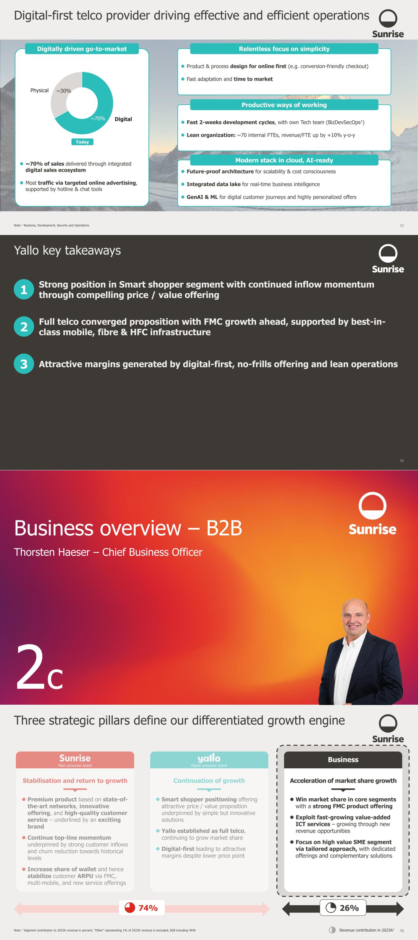 Digital-first telco provider driving effective and efficient operations Note: 1 Business, Development, Security and Operations ⚫ ~70% of sales delivered through integrated digital sales ecosystem ⚫ Most traffic via targeted online advertising, supported by hotline & chat tools Digitally driven go-to-market ⚫ Product & process design for online first (e.g. conversion-friendly checkout) ⚫ Fast adaptation and time to market Relentless focus on simplicity ⚫ Fast 2-weeks development cycles, with own Tech team (BizDevSecOps1) ⚫ Lean organization: ~70 internal FTEs, revenue/FTE up by +10% y-o-y Productive ways of working ⚫ Future-proof architecture for scalability & cost consciousness ⚫ Integrated data lake for real-time business intelligence ⚫ GenAI & ML for digital customer journeys and highly personalized offers Modern stack in cloud, AI-ready ~70% Physical Digital ~30% Today 45 46 Sunrise B2B key takeaways Yallo k y takeaways Strong position in Smart shopper segment with continued inflow momentum through compelling price / value offering Full telco converged proposition with FMC growth ahead, supported by best-in- class mobile, fibre & HFC infrastructure Attractive margins generated by digital-first, no-frills offering and lean operations 1 2 3 Business overview – B2B Thorsten Haeser – Chief Business Officer 2c Note: 1 Segment contribution to 2023A revenue in percent, “Other” representing 1% of 2023A revenue is excluded, B2B including WHS Continuation of growth ⚫ Smart shopper positioning offering attractive price / value proposition underpinned by simple but innovative solutions ⚫ Yallo established as full telco, continuing to grow market share ⚫ Digital-first leading to attractive margins despite lower price point Digital consumer brand Three strategic pillars define our differentiated growth engine Stabilisation and return to growth ⚫ Premium product based on state-of- the-art networks, innovative offering, and high-quality customer service – underlined by an exciting brand ⚫ Continue top-line momentum underpinned by strong customer inflows and churn reduction towards historical levels ⚫ Increase share of wallet and hence stabilize customer ARPU via FMC, multi-mobile, and new service offerings Main consumer brand Acceleration of market share growth ⚫ Win market share in core segments with a strong FMC product offering ⚫ Exploit fast-growing value-added ICT services – growing through new revenue opportunities ⚫ Focus on high value SME segment via tailored approach, with dedicated offerings and complementary solutions Business 74% 26% Revenue contribution in 2023A1 48