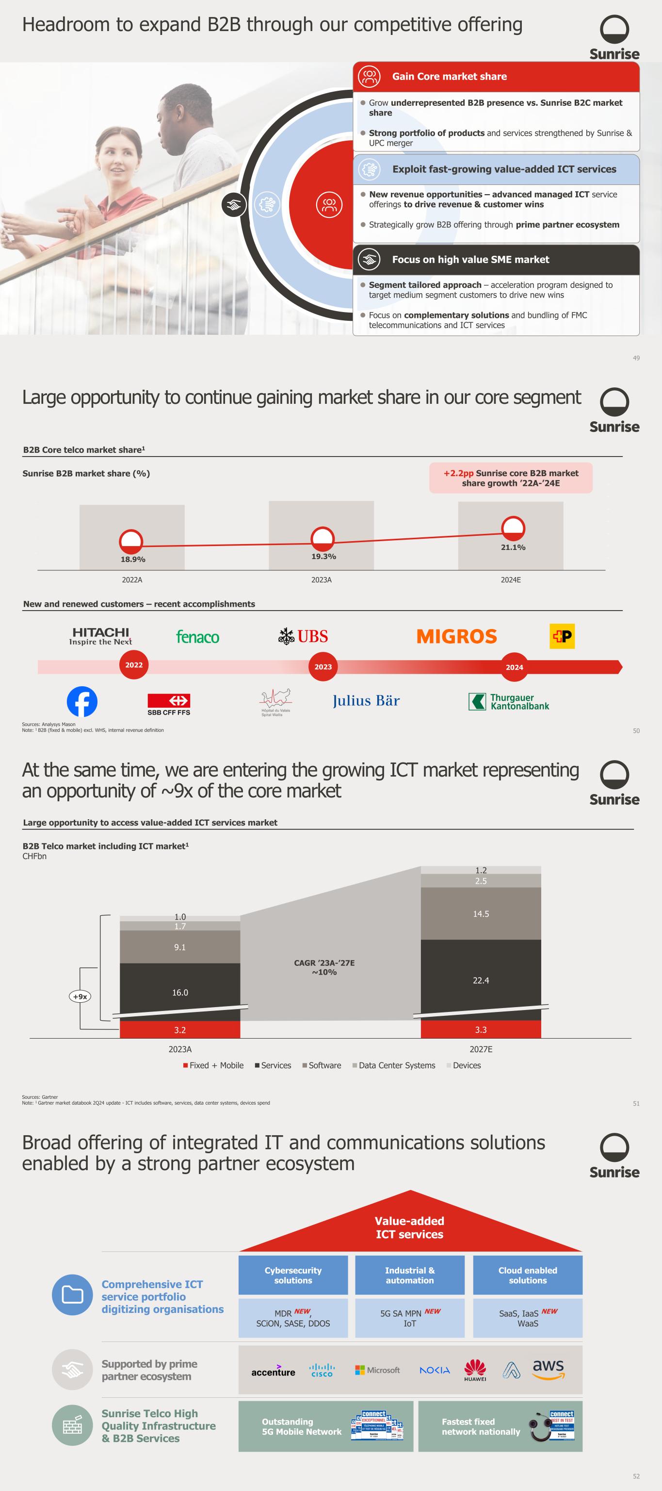 Headroom to expand B2B through our competitive offering ⚫ Grow underrepresented B2B presence vs. Sunrise B2C market share ⚫ Strong portfolio of products and services strengthened by Sunrise & UPC merger Gain Core market share ⚫ New revenue opportunities – advanced managed ICT service offerings to drive revenue & customer wins ⚫ Strategically grow B2B offering through prime partner ecosystem Exploit fast-growing value-added ICT services ⚫ Segment tailored approach – acceleration program designed to target medium segment customers to drive new wins ⚫ Focus on complementary solutions and bundling of FMC telecommunications and ICT services Focus on high value SME market 49 New and renewed customers – recent accomplishments Sources: Analysys Mason Note: 1 B2B (fixed & mobile) excl. WHS, internal revenue definition 2022 2023 2024 18.9% 19.3% 21.1% 15% 17% 19% 21% 23% 25% 27% 29% 2’000.00 2’200.00 2’400.00 2’600.00 2’800.00 3’000.00 2022A 2023A 2024E +2.2pp Sunrise core B2B market share growth ’22A-’24E B2B Core telco market share1 Large opportunity to continue gaining market share in our core segment Sunrise B2B market share (%) 50 3.2 3.3 16.0 22.4 9.1 14.5 1.7 2.5 1.0 1.2 2023A 2027E Fixed + Mobile Services Software Data Center Systems Devices Sources: Gartner Note: 1 Gartner market databook 2Q24 update - ICT includes software, services, data center systems, devices spend B2B Telco market including ICT market1 CHFbn Large opportunity to access value-added ICT services market +9x At the same time, we are entering the growing ICT market representing an opportunity of ~9x of the core market CAGR ’23A-’27E ~10% 51 Cybersecurity solutions Cloud enabled solutions Industrial & automation Value-added ICT services Comprehensive ICT service portfolio digitizing organisations MDR NEW, SCiON, SASE, DDOS SaaS, IaaS NEW WaaS 5G SA MPN NEW IoT Broad offering of integrated IT and communications solutions enabled by a strong partner ecosystem Sunrise Telco High Quality Infrastructure & B2B Services Outstanding 5G Mobile Network Fastest fixed network nationally Supported by prime partner ecosystem 52