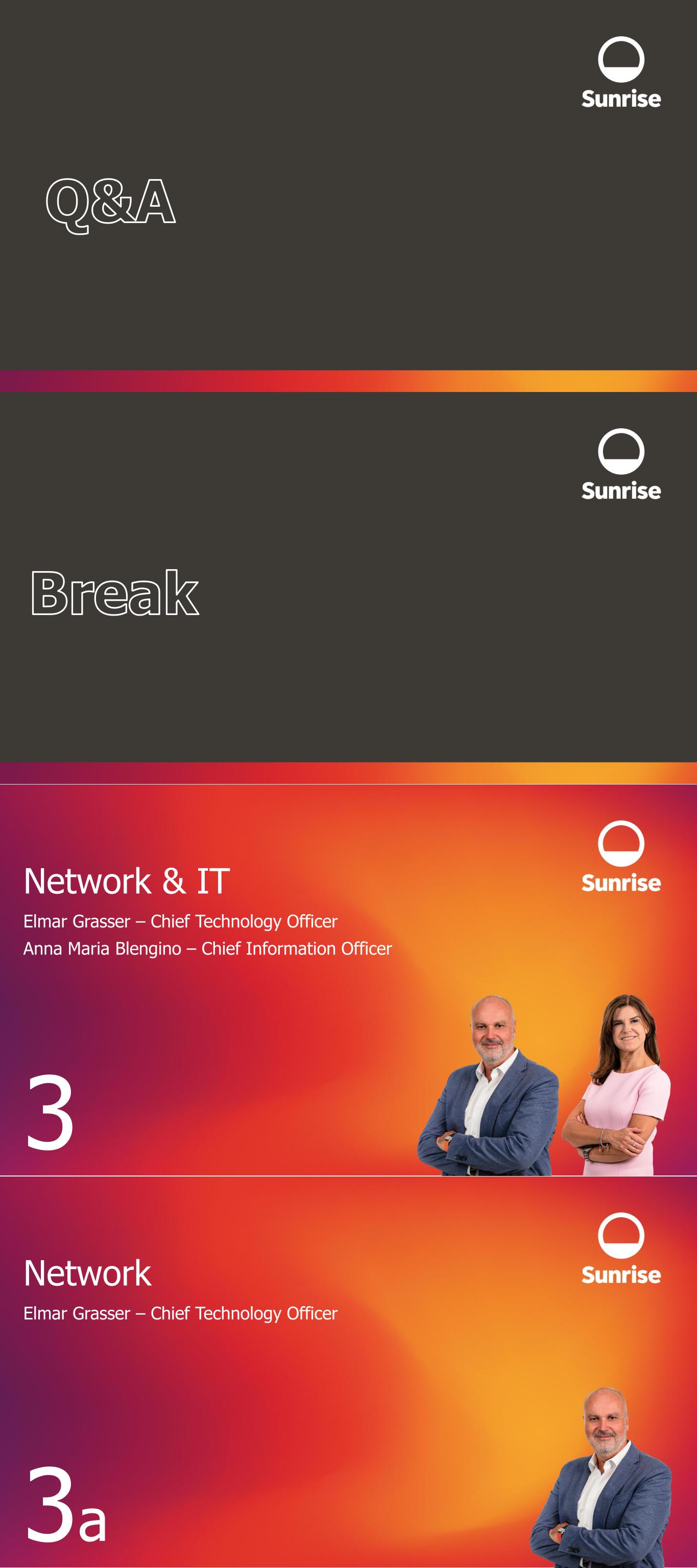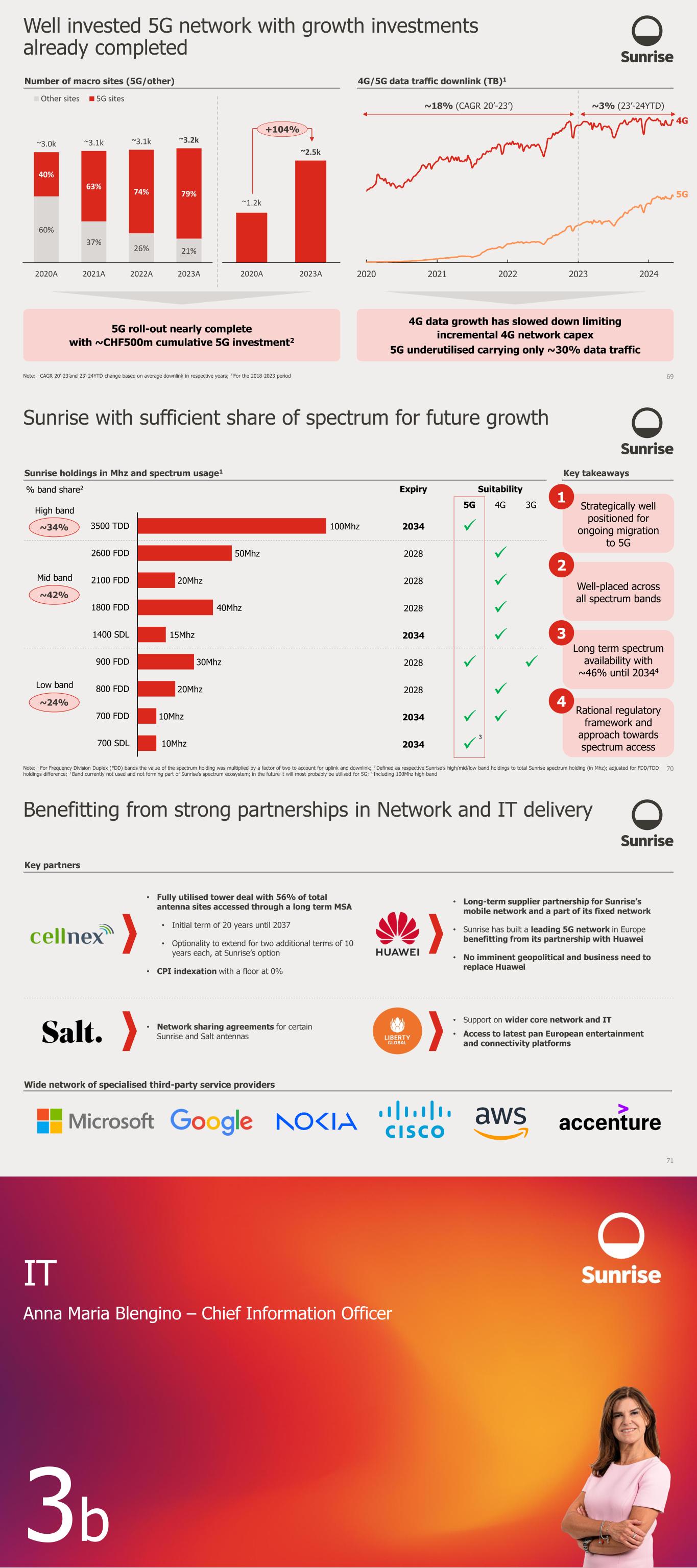 69 2020 2021 2022 2023 2024 Well invested 5G network with growth investments already completed 4G data growth has slowed down limiting incremental 4G network capex 5G underutilised carrying only ~30% data traffic Note: 1 CAGR 20’-23’and 23’-24YTD change based on average downlink in respective years; 2 For the 2018-2023 period 5G roll-out nearly complete with ~CHF500m cumulative 5G investment2 60% 37% 26% 21% 40% 63% 74% 79% ~3.0k ~3.1k ~3.1k ~3.2k 2020A 2021A 2022A 2023A Other sites 5G sites ~1.2k ~2.5k 2020A 2023A +104% ~18% (CAGR 20’-23’) ~3% (23’-24YTD) 4G 5G Number of macro sites (5G/other) 4G/5G data traffic downlink (TB)1 70 Suitability 5G 4G 3G ✓ ✓ ✓ ✓ ✓ ✓ ✓ ✓ ✓ ✓ ✓ 100Mhz 50Mhz 20Mhz 40Mhz 15Mhz 30Mhz 20Mhz 10Mhz 10Mhz 3500 TDD 2600 FDD 2100 FDD 1800 FDD 1400 SDL 900 FDD 800 FDD 700 FDD 700 SDL Sunrise with sufficient share of spectrum for future growth Note: 1 For Frequency Division Duplex (FDD) bands the value of the spectrum holding was multiplied by a factor of two to account for uplink and downlink; 2 Defined as respective Sunrise’s high/mid/low band holdings to total Sunrise spectrum holding (in Mhz); adjusted for FDD/TDD holdings difference; 3 Band currently not used and not forming part of Sunrise’s spectrum ecosystem; in the future it will most probably be utilised for 5G; 4 Including 100Mhz high band % band share2 ~34% ~42% ~24% High band Mid band Low band Expiry 2034 2028 2028 2028 2034 2028 2028 2034 2034 Strategically well positioned for ongoing migration to 5G Well-placed across all spectrum bands Long term spectrum availability with ~46% until 20344 Sunrise holdings in Mhz and spectrum usage1 Key takeaways 3 Rational regulatory framework and approach towards spectrum access 1 2 3 4 71 • Fully utilised tower deal with 56% of total antenna sites accessed through a long term MSA • Initial term of 20 years until 2037 • Optionality to extend for two additional terms of 10 years each, at Sunrise’s option • CPI indexation with a floor at 0% • Long-term supplier partnership for Sunrise’s mobile network and a part of its fixed network • Sunrise has built a leading 5G network in Europe benefitting from its partnership with Huawei • No imminent geopolitical and business need to replace Huawei Benefitting from strong partnerships in Network and IT delivery • Network sharing agreements for certain Sunrise and Salt antennas • Support on wider core network and IT • Access to latest pan European entertainment and connectivity platforms Wide network of specialised third-party service providers Key partners IT Anna Maria Blengino – Chief Information Officer 3b