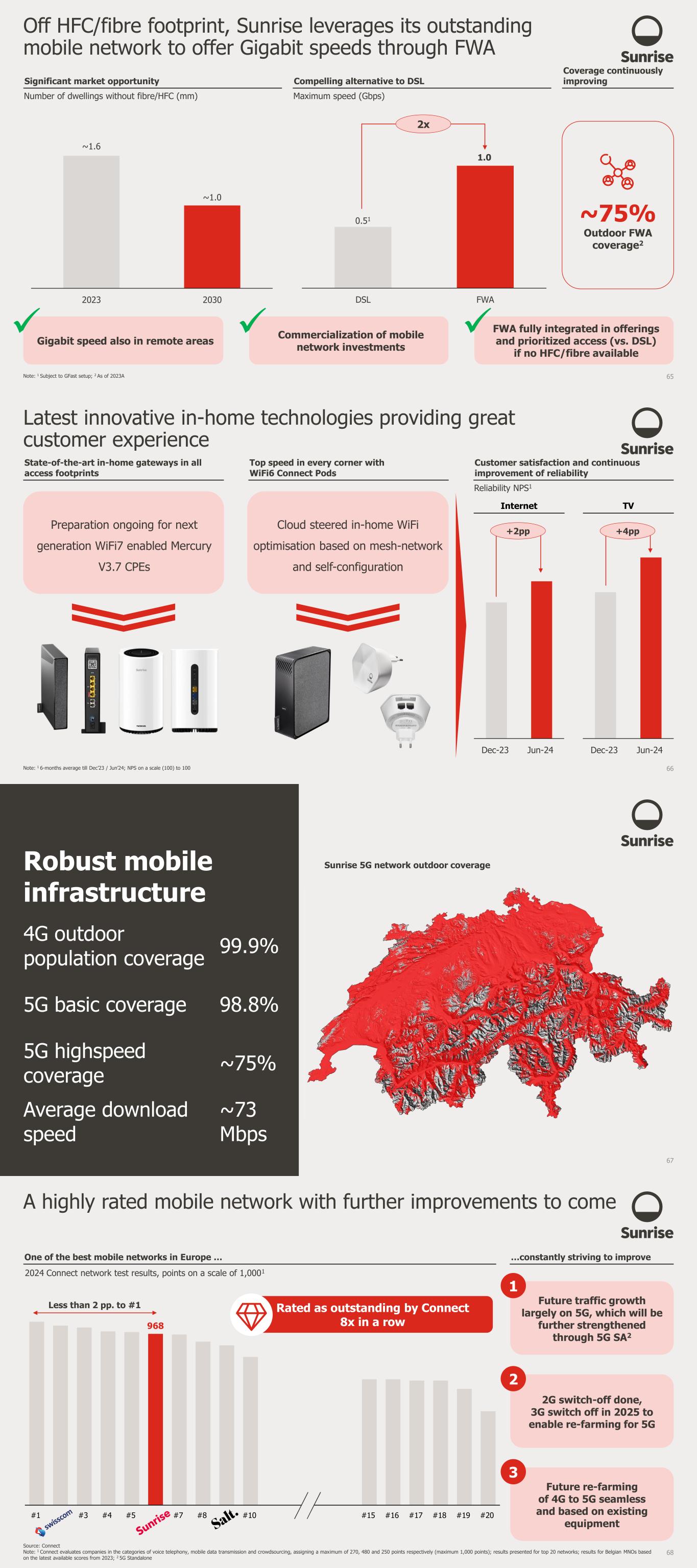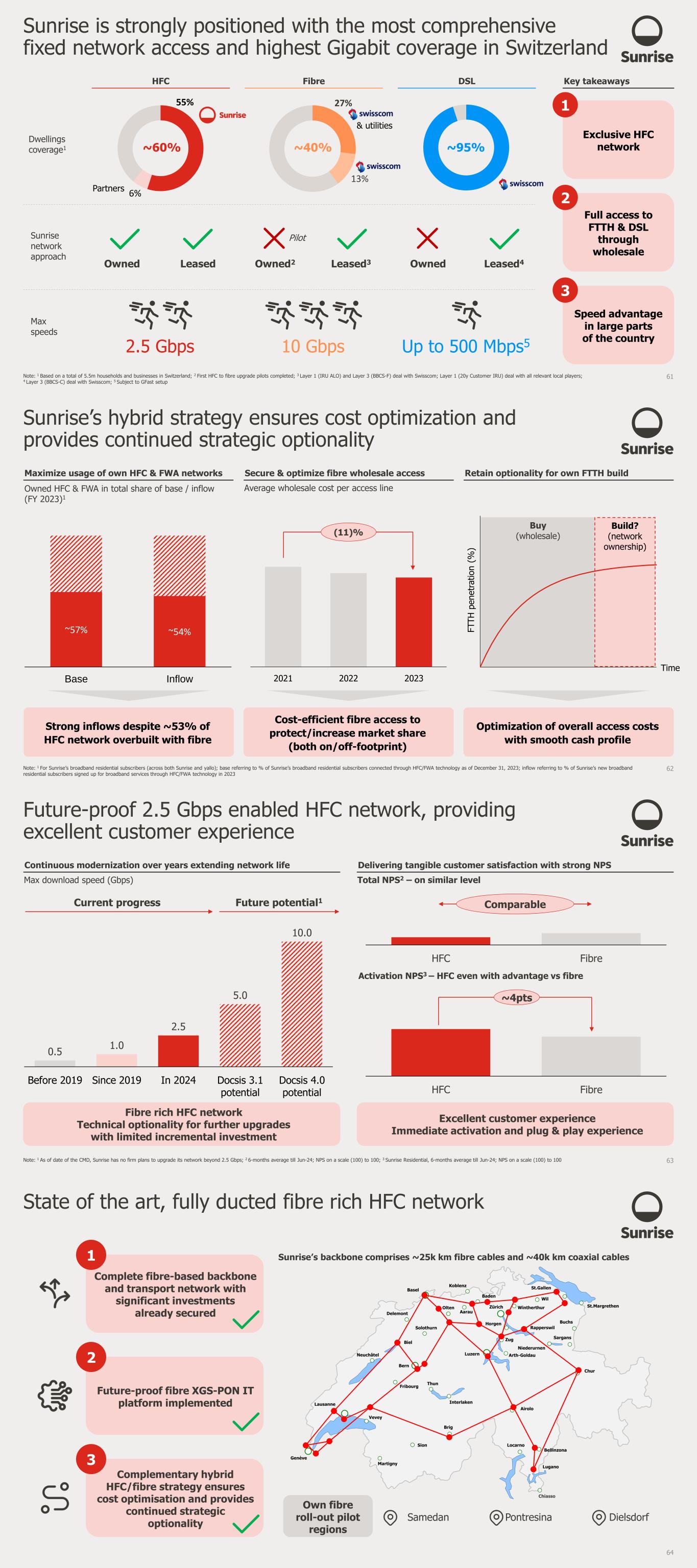 61Note: 1 Based on a total of 5.5m households and businesses in Switzerland; 2 First HFC to fibre upgrade pilots completed; 3 Layer 1 (IRU ALO) and Layer 3 (BBCS-F) deal with Swisscom; Layer 1 (20y Customer IRU) deal with all relevant local players; 4 Layer 3 (BBCS-C) deal with Swisscom; 5 Subject to GFast setup ~60% 55% 6% 27% 13% Sunrise is strongly positioned with the most comprehensive fixed network access and highest Gigabit coverage in Switzerland 2.5 Gbps 10 Gbps Up to 500 Mbps5 Owned Leased Owned2 Leased3 Owned Leased4 ~40% ~95% & utilities Partners Pilot Exclusive HFC network 1 Full access to FTTH & DSL through wholesale Speed advantage in large parts of the country 2 3 Key takeawaysHFC Fibre DSL Sunrise network approach Max speeds Dwellings coverage1 62 Buy (wholesale) Build? (network ownership) Sunrise’s hybrid strategy ensures cost optimization and provides continued strategic optionality Strong inflows despite ~53% of HFC network overbuilt with fibre Cost-efficient fibre access to protect/increase market share (both on/off-footprint) Optimization of overall access costs with smooth cash profile 2021 2022 2023 F T T H p e n e tr a ti o n ( % ) Time ~57% ~54% Base Inflow (11)% Maximize usage of own HFC & FWA networks Secure & optimize fibre wholesale access Retain optionality for own FTTH build Owned HFC & FWA in total share of base / inflow (FY 2023)1 Average wholesale cost per access line Note: 1 For Sunrise’s broadband residential subscribers (across both Sunrise and yallo); base referring to % of Sunrise’s broadband residential subscribers connected through HFC/FWA technology as of December 31, 2023; inflow referring to % of Sunrise’s new broadband residential subscribers signed up for broadband services through HFC/FWA technology in 2023 63 HFC Fibre 0.5 1.0 2.5 5.0 10.0 Before 2019 Since 2019 In 2024 Docsis 3.1 potential Docsis 4.0 potential HFC Fibre Future-proof 2.5 Gbps enabled HFC network, providing excellent customer experience Note: 1 As of date of the CMD, Sunrise has no firm plans to upgrade its network beyond 2.5 Gbps; 2 6-months average till Jun-24; NPS on a scale (100) to 100; 3 Sunrise Residential, 6-months average till Jun-24; NPS on a scale (100) to 100 Activation NPS3 – HFC even with advantage vs fibre Excellent customer experience Immediate activation and plug & play experience Fibre rich HFC network Technical optionality for further upgrades with limited incremental investment Current progress Future potential1 Comparable Continuous modernization over years extending network life Delivering tangible customer satisfaction with strong NPS Max download speed (Gbps) Total NPS2 – on similar level ~4pts 64 State of the art, fully ducted fibre rich HFC network Complementary hybrid HFC/fibre strategy ensures cost optimisation and provides continued strategic optionality 3 Future-proof fibre XGS-PON IT platform implemented 2 Complete fibre-based backbone and transport network with significant investments already secured 1 Own fibre roll-out pilot regions Samedan Pontresina Dielsdorf Sunrise’s backbone comprises ~25k km fibre cables and ~40k km coaxial cables Zürich Wintherthur St.Gallen Wil St.Margrethen Sargans Buchs Chur Horgen Zug Luzern Airolo Chiasso Locarno Bellinzona Lugano Niederurnen Rapperswil Arth-Goldau Basel Delemont Biel Neuchâtel Bern Thun Brig Sion Martigny Vevey Lausanne Genève Solothurn Olten Aarau Baden Koblenz Fribourg Interlaken