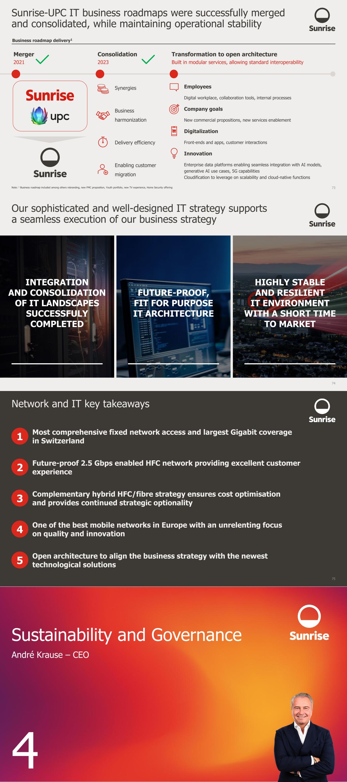 73 Sunrise-UPC IT business roadmaps were successfully merged and consolidated, while maintaining operational stability Note: 1 Business roadmap included among others rebranding, new FMC proposition, Youth portfolio, new TV experience, Home Security offering Business roadmap delivery1 Merger 2021 Transformation to open architecture Built in modular services, allowing standard interoperability Consolidation 2023 Synergies Business harmonization Delivery efficiency Enabling customer migration Employees Digital workplace, collaboration tools, internal processes Company goals New commercial propositions, new services enablement Digitalization Front-ends and apps, customer interactions Innovation Enterprise data platforms enabling seamless integration with AI models, generative AI use cases, 5G capabilities Cloudification to leverage on scalability and cloud-native functions 74 Our sophisticated and well-designed IT strategy supports a seamless execution of our business strategy INTEGRATION AND CONSOLIDATION OF IT LANDSCAPES SUCCESSFULY COMPLETED FUTURE-PROOF, FIT FOR PURPOSE IT ARCHITECTURE HIGHLY STABLE AND RESILIENT IT ENVIRONMENT WITH A SHORT TIME TO MARKET 75 Switzerland’s premium and scaled challenger – primed for growth and cash returns Netwo k and IT key takeaways Most comprehensive fixed network access and largest Gigabit coverage in Switzerland Future-proof 2.5 Gbps enabled HFC network providing excellent customer experience Complementary hybrid HFC/fibre strategy ensures cost optimisation and provides continued strategic optionality One of the best mobile networks in Europe with an unrelenting focus on quality and innovation 1 2 3 4 Open architecture to align the business strategy with the newest technological solutions5 Sustainability and Governance André Krause – CEO 4