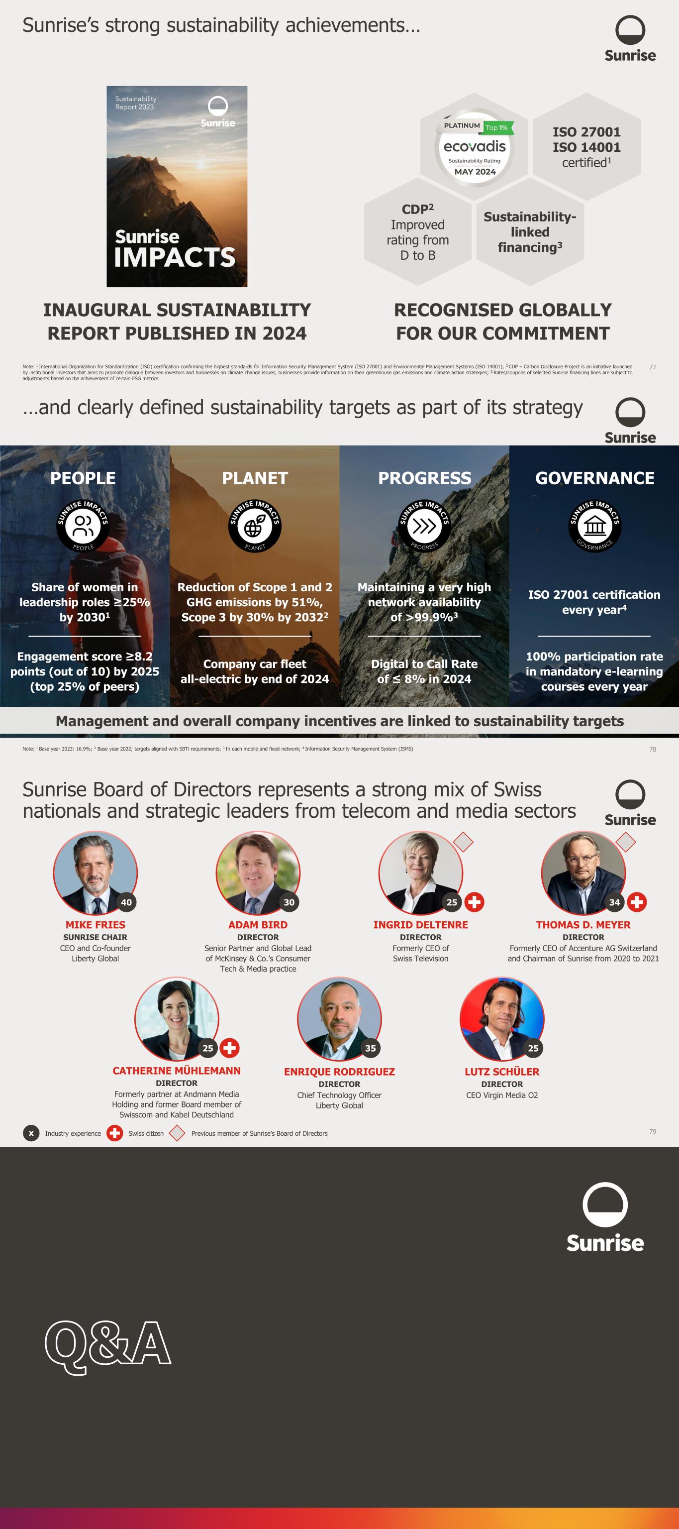 77 Sunrise’s strong sustainability achievements… Note: 1 International Organization for Standardization (ISO) certification confirming the highest standards for Information Security Management System (ISO 27001) and Environmental Management Systems (ISO 14001); 2 CDP – Carbon Disclosure Project is an initiative launched by institutional investors that aims to promote dialogue between investors and businesses on climate change issues; businesses provide information on their greenhouse gas emissions and climate action strategies; 3 Rates/coupons of selected Sunrise financing lines are subject to adjustments based on the achievement of certain ESG metrics INAUGURAL SUSTAINABILITY REPORT PUBLISHED IN 2024 RECOGNISED GLOBALLY FOR OUR COMMITMENT CDP2 Improved rating from D to B ISO 27001 ISO 14001 certified1 Sustainability- linked financing3 78 …and clearly defined sustainability targets as part of its strategy Share of women in leadership roles ≥25% by 20301 Reduction of Scope 1 and 2 GHG emissions by 51%, Scope 3 by 30% by 20322 Maintaining a very high network availability of >99.9%3 ISO 27001 certification every year4 PEOPLE PLANET PROGRESS GOVERNANCE Management and overall company incentives are linked to sustainability targets Engagement score ≥8.2 points (out of 10) by 2025 (top 25% of peers) Company car fleet all-electric by end of 2024 Digital to Call Rate of ≤ 8% in 2024 100% participation rate in mandatory e-learning courses every year Note: 1 Base year 2023: 16.9%; 2 Base year 2022; targets aligned with SBTi requirements; 3 In each mobile and fixed network; 4 Information Security Management System (ISMS) 79 Sunrise Board of Directors represents a strong mix of Swiss nationals and strategic leaders from telecom and media sectors x Industry experience ADAM BIRD DIRECTOR Senior Partner and Global Lead of McKinsey & Co.’s Consumer Tech & Media practice 30 MIKE FRIES SUNRISE CHAIR CEO and Co-founder Liberty Global CATHERINE MÜHLEMANN DIRECTOR Formerly partner at Andmann Media Holding and former Board member of Swisscom and Kabel Deutschland ENRIQUE RODRIGUEZ DIRECTOR Chief Technology Officer Liberty Global 35 LUTZ SCHÜLER DIRECTOR CEO Virgin Media O2 25 INGRID DELTENRE DIRECTOR Formerly CEO of Swiss Television THOMAS D. MEYER DIRECTOR Formerly CEO of Accenture AG Switzerland and Chairman of Sunrise from 2020 to 2021 Swiss citizen 25 Previous member of Sunrise’s Board of Directors 25 3440 80 Q&A