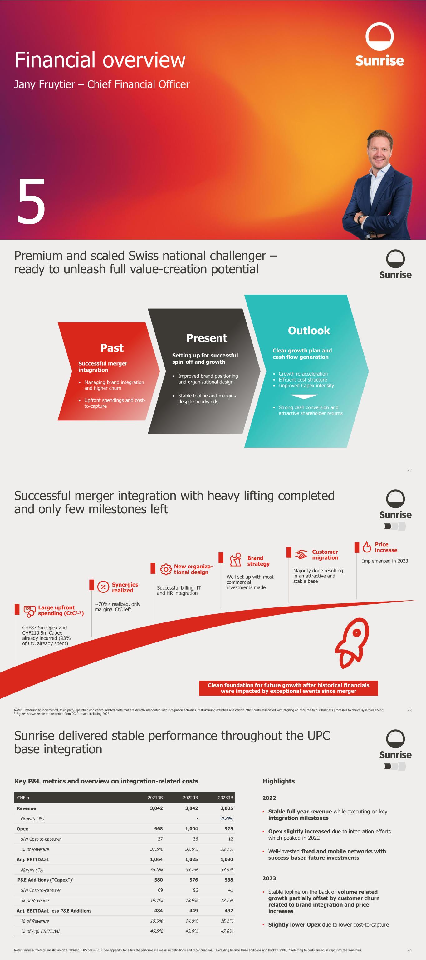 Financial overview Jany Fruytier – Chief Financial Officer 5 82 Premium and scaled Swiss national challenger – ready to unleash full value-creation potential Past Successful merger integration • Managing brand integration and higher churn • Upfront spendings and cost- to-capture Present Setting up for successful spin-off and growth • Improved brand positioning and organizational design • Stable topline and margins despite headwinds Outlook Clear growth plan and cash flow generation • Growth re-acceleration • Efficient cost structure • Improved Capex intensity • Strong cash conversion and attractive shareholder returns 83 Successful merger integration with heavy lifting completed and only few milestones left Note: 1 Referring to incremental, third-party operating and capital related costs that are directly associated with integration activities, restructuring activities and certain other costs associated with aligning an acquiree to our business processes to derive synergies spent; 2 Figures shown relate to the period from 2020 to and including 2023 Clean foundation for future growth after historical financials were impacted by exceptional events since merger CHF87.5m Opex and CHF210.5m Capex already incurred (93% of CtC already spent) ~70%2 realized, only marginal CtC left Well set-up with most commercial investments made Majority done resulting in an attractive and stable base Implemented in 2023 Successful billing, IT and HR integration Large upfront spending (CtC1,2) Synergies realized New organiza- tional design Brand strategy Customer migration Price increase 84 Sunrise delivered stable performance throughout the UPC base integration HighlightsKey P&L metrics and overview on integration-related costs CHFm 2021RB 2022RB 2023RB Revenue 3,042 3,042 3,035 Growth (%) - (0.2%) Opex 968 1,004 975 o/w Cost-to-capture2 27 36 12 % of Revenue 31.8% 33.0% 32.1% Adj. EBITDAaL 1,064 1,025 1,030 Margin (%) 35.0% 33.7% 33.9% P&E Additions (“Capex”)1 580 576 538 o/w Cost-to-capture2 69 96 41 % of Revenue 19.1% 18.9% 17.7% Adj. EBITDAaL less P&E Additions 484 449 492 % of Revenue 15.9% 14.8% 16.2% % of Adj. EBITDAaL 45.5% 43.8% 47.8% Note: Financial metrics are shown on a rebased IFRS basis (RB); See appendix for alternate performance measure definitions and reconciliations; 1 Excluding finance lease additions and hockey rights; 2 Referring to costs arising in capturing the synergies 2022 • Stable full year revenue while executing on key integration milestones • Opex slightly increased due to integration efforts which peaked in 2022 • Well-invested fixed and mobile networks with success-based future investments 2023 • Stable topline on the back of volume related growth partially offset by customer churn related to brand integration and price increases • Slightly lower Opex due to lower cost-to-capture