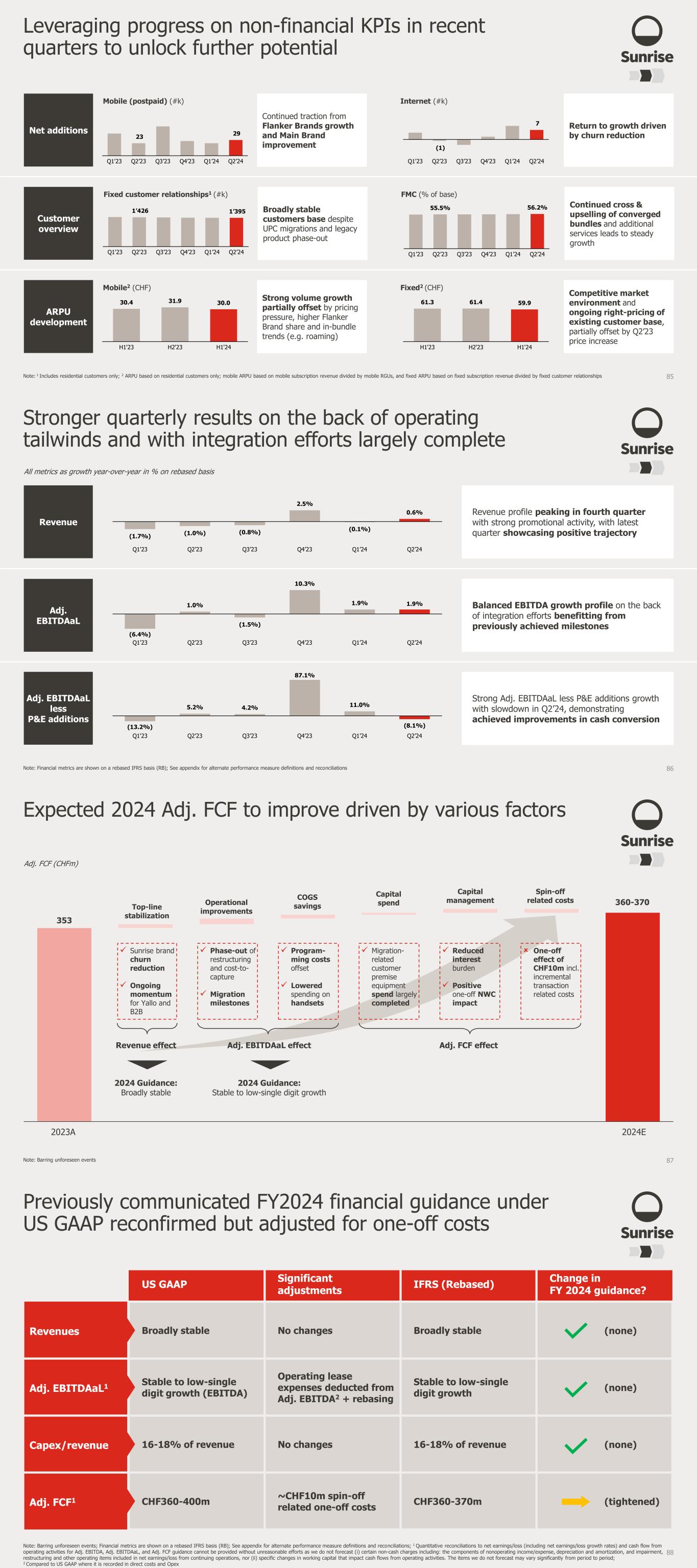 Sunrise reconfirms its previously communicated US GAAP 2024 revenue, Adjusted EBIDTAaL and capex guidance, while updating Adjusted Free Cash Flow guidance for certain spin-related costs. As updated, Adjusted FCF will be impacted by one-time costs related to the spin-off under IFRS, Sunrise expects to achieve CHF 360-370 million for this year: